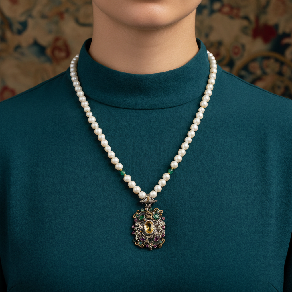 İnci taşının zarif ışıltısı, zümrüdün derin yeşil tonları ve sitrinin parlak sarısı, el işçiliğiyle hazırlanmış bu özel koleksiyon kolyede buluşuyor. Günlük kombinlere sofistike bir dokunuş katan bu özel parça, özel günlerde de şıklığınızı tamamlayan seçkin bir aksesuar olur. Doğal taşların uyumlu birlikteliği, tasarıma özgün ve zamansız bir karakter kazandırır.