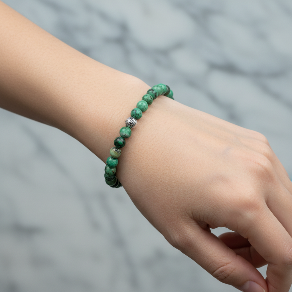Canlı yeşil tonlarıyla dikkat çeken İspanyol Varisit 6mm Doğal Taş Bileklik, zarif ve modern tasarımıyla bileğinizde estetik bir görünüm sunar. 6mm çapındaki doğal varisit taşları, özgün desenleri ve renk geçişleriyle günlük kombinlerde şık bir detay, özel davetlerde ise sofistike bir tamamlayıcı aksesuar olarak öne çıkar.