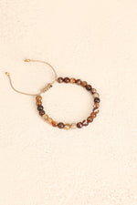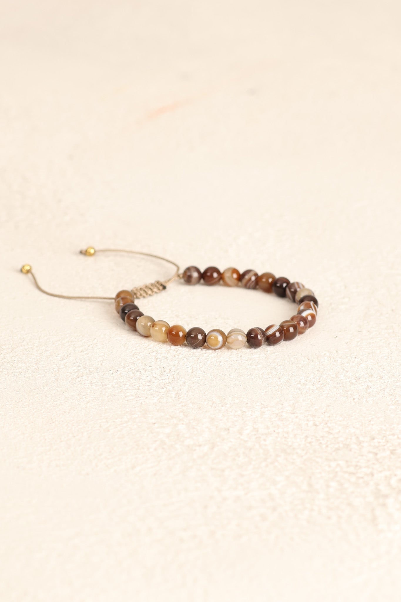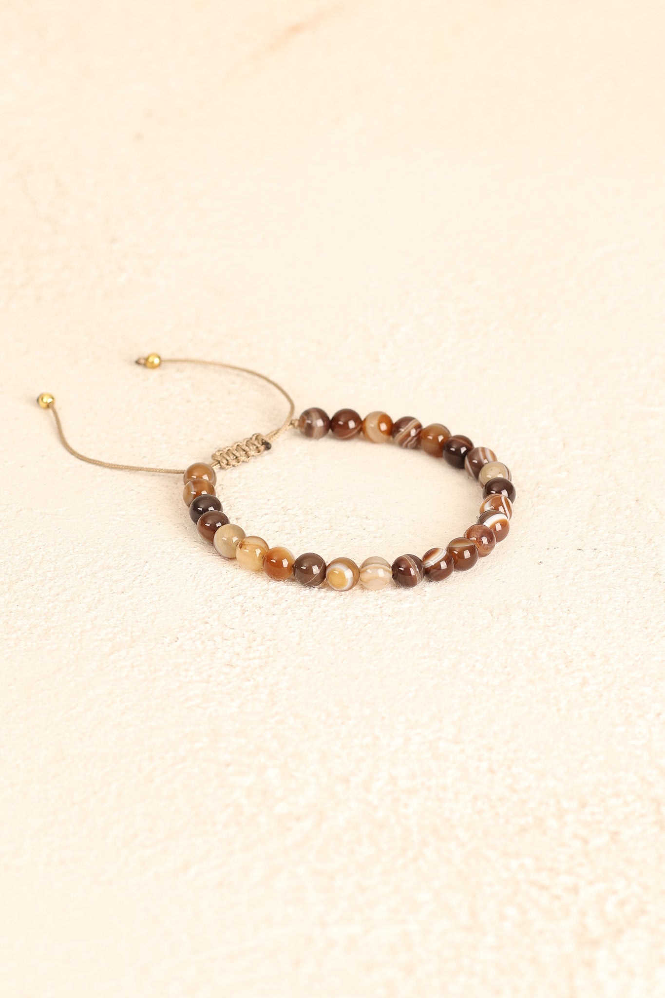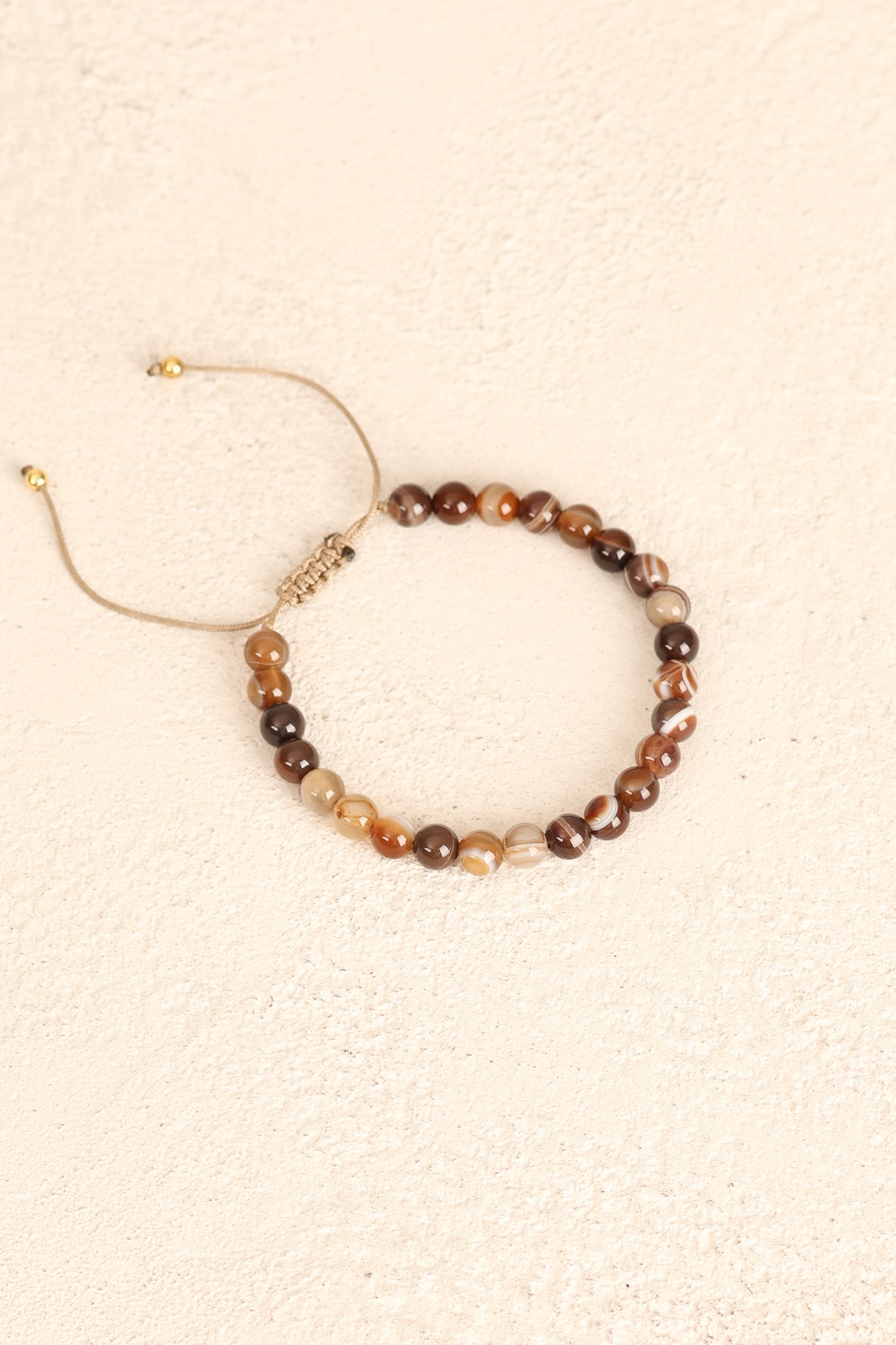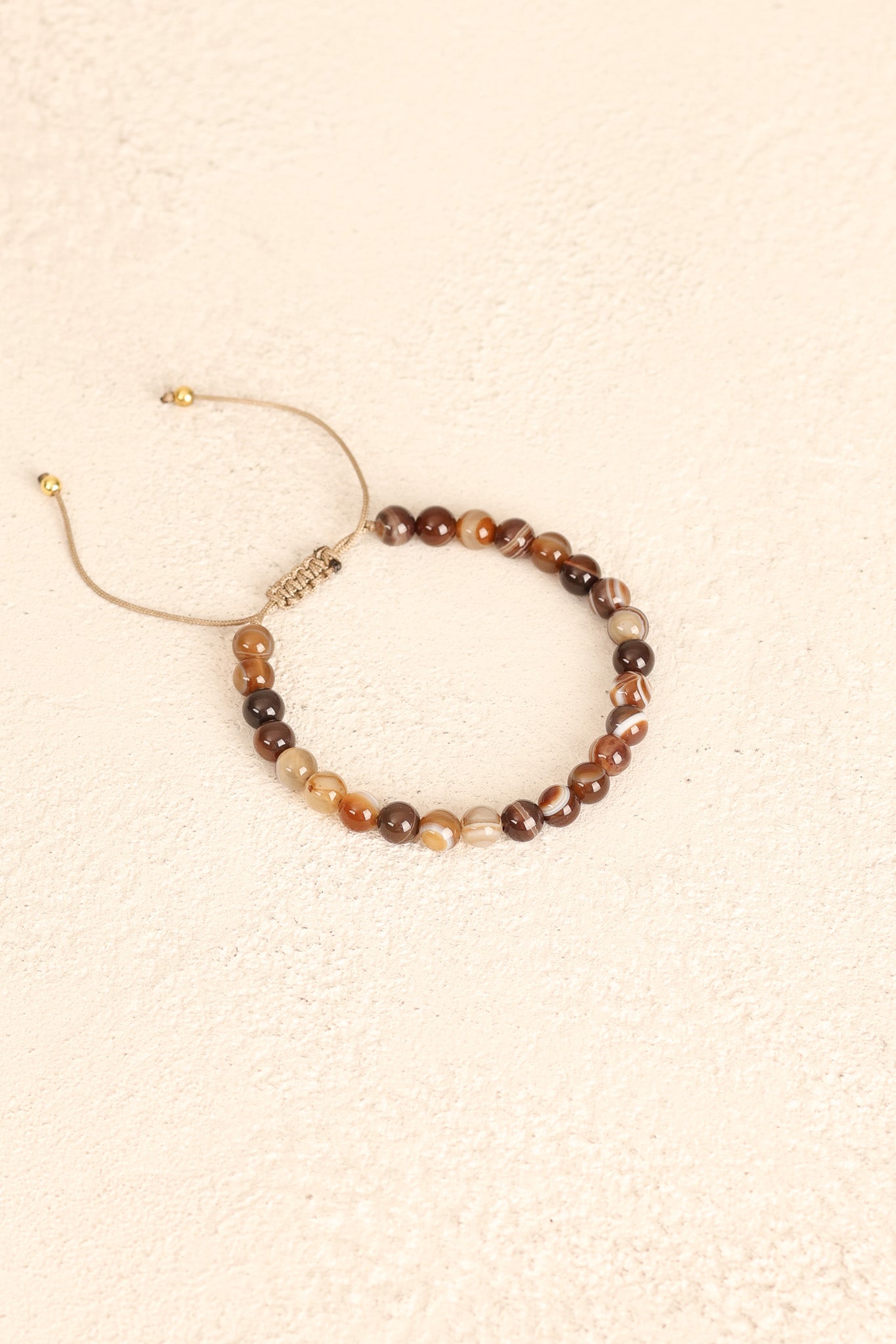 Kahve tonlarının doğal dalgalanmalarını yansıtan akik taşları, sade ama dikkat çekici bir şıklık sunar. El yapımı makrome örgü, bilekliğin formunu uzun süre korurken konforlu bir kullanım sağlar. Günlük kombinlerde doğal, sıcak ve dengeli bir tarz yaratmak isteyenler için ideal bir seçimdir.