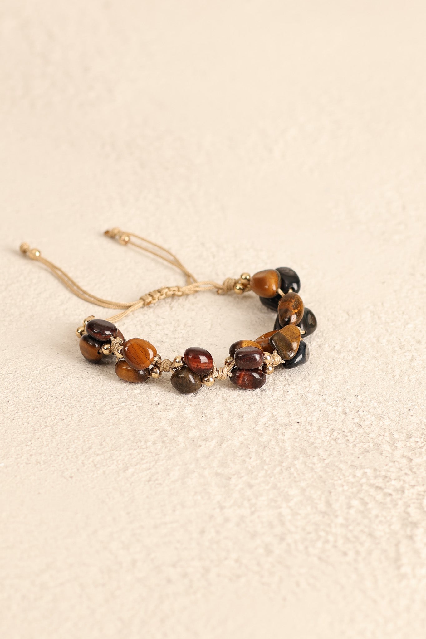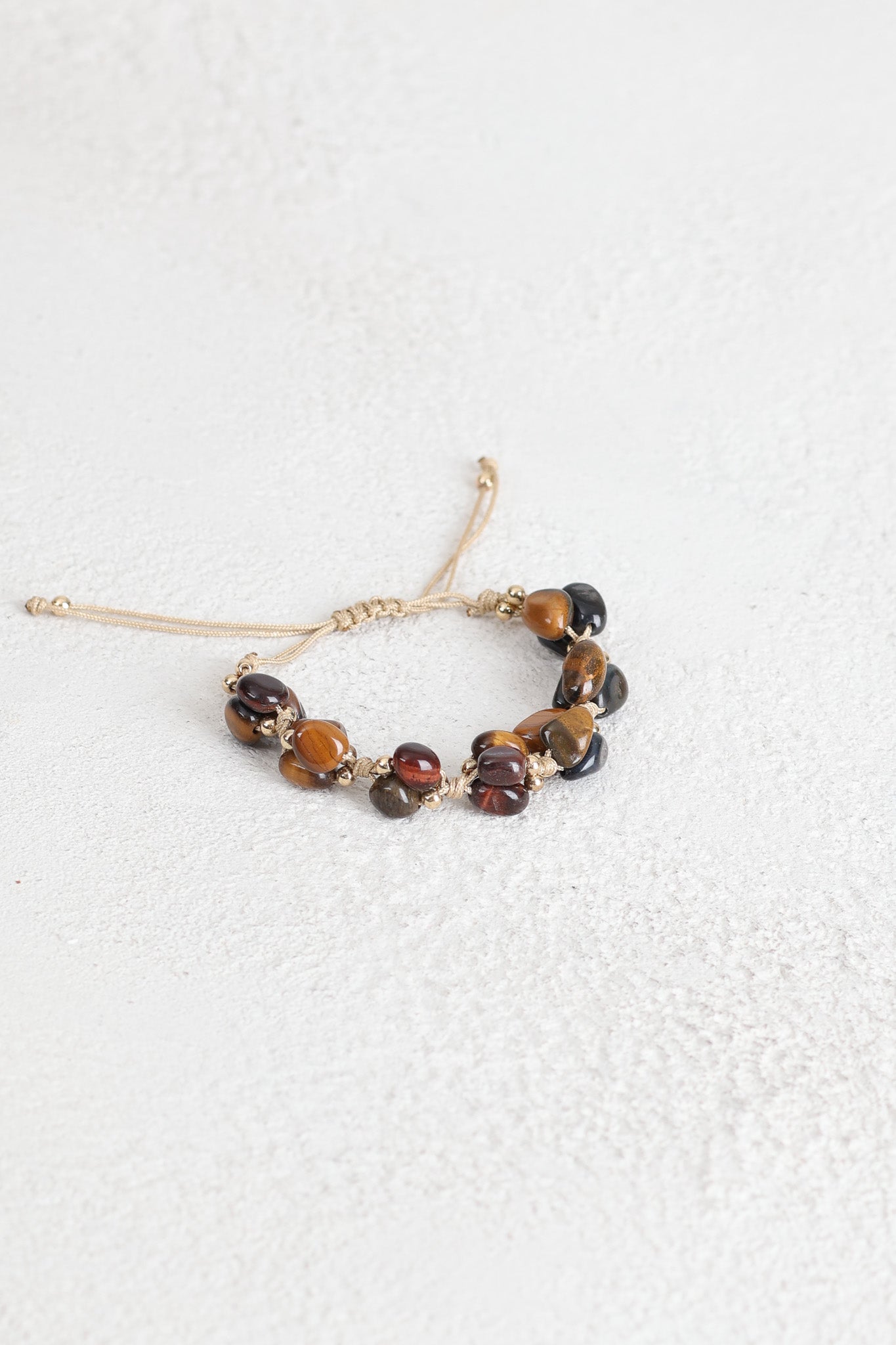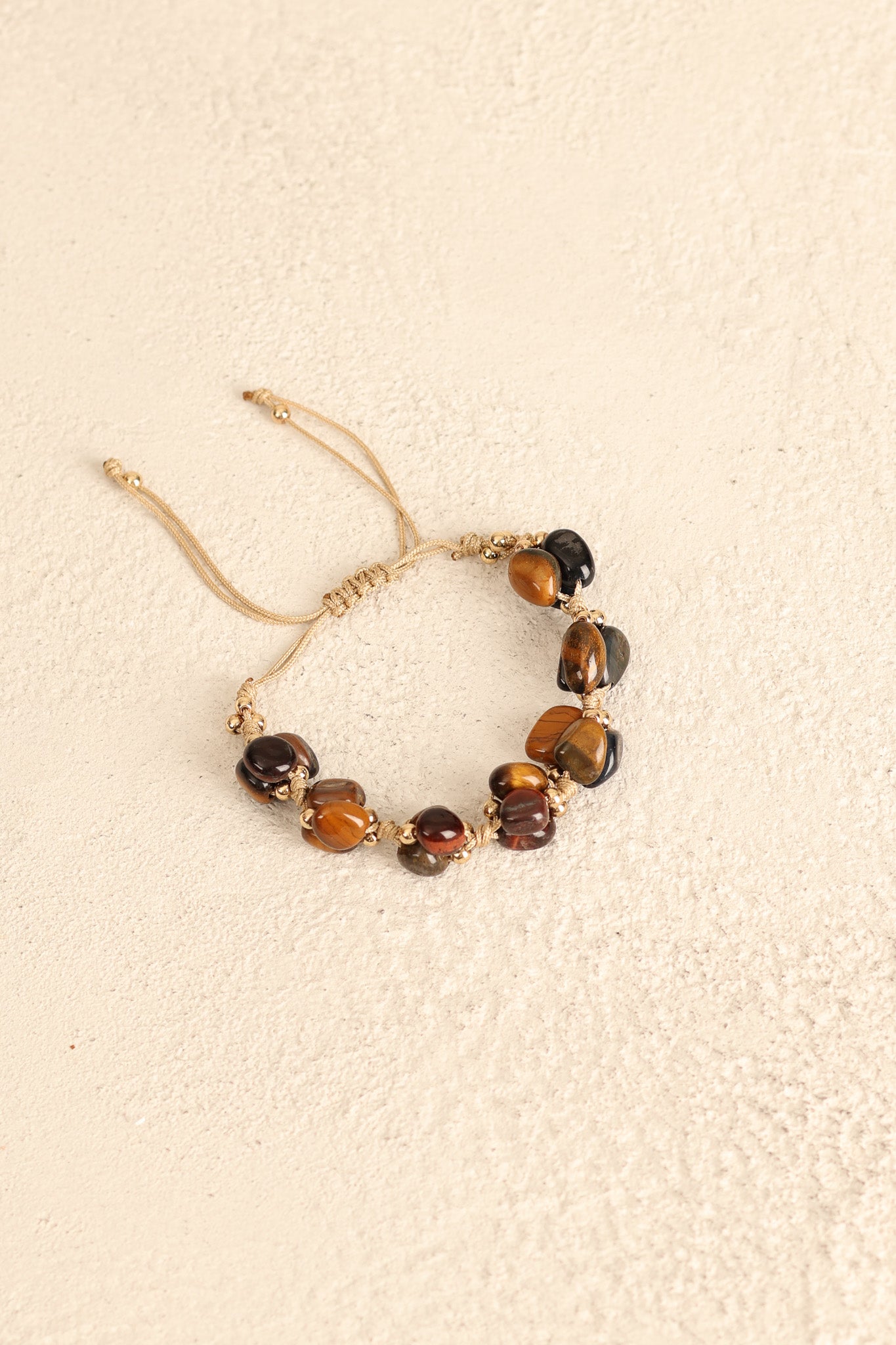 Kaplan gözü taşının doğal altın ve kahverengi geçişleri, ışığa göre değişen benzersiz bir parıltı sunar. El yapımı makrome örgü, bilekliğe hem dayanıklılık hem de zarif bir esneklik kazandırır. Gündelik kullanımda olduğu kadar özel günlerde de doğal şıklık arayanlar için ideal bir tercihtir.