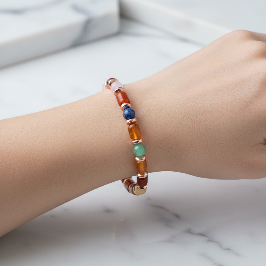 Kız Öğrenci Doğal Taş Bileklik – Kırmızı Akik, Yeşil Aventurin, Lapis Lazuli, Ay Taşı, Kalsit, Sodalit, Pembe Kuvars & Hematit – Özel Tasarım