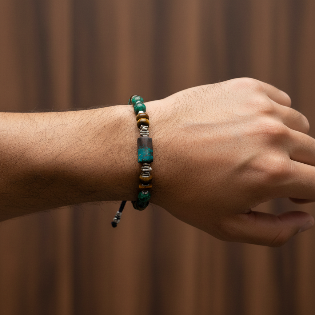 Krizokolun mavi-yeşil dokusu, kaplan gözünün altın kahverengi yansımaları, azurit malakit taşının derin desenleri ve hematitin metalik parlaklığı 925 ayar gümüş detaylarla birleşerek güçlü ve maskülen bir bileklik tasarımı ortaya çıkarıyor. El işçiliğiyle özenle hazırlanmış bu özel parça; günlük kombinlerde karizmatik bir dokunuş sunarken, özel günlerde de sofistike bir tamamlayıcıdır.