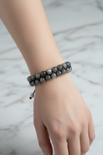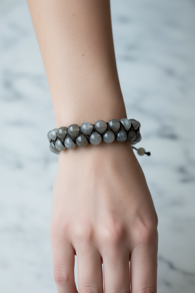 Gri zemin üzerinde mavi ve yeşil ışık oyunlarıyla öne çıkan Labradorit 8mm Çift Sıra Makrome Doğal Taş Bileklik, sofistike ve modern tasarımıyla bileğinizde dikkat çekici bir şıklık sunar. 8mm çapındaki doğal labradorit taşları çift sıra halinde dizilmiş, el yapımı makrome örgü ile hazırlanmıştır. Günlük kombinlerde zarif bir detay sağlarken, özel anlarda da güçlü bir tamamlayıcı aksesuar olarak tercih edilebilir.