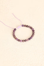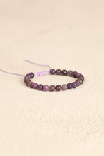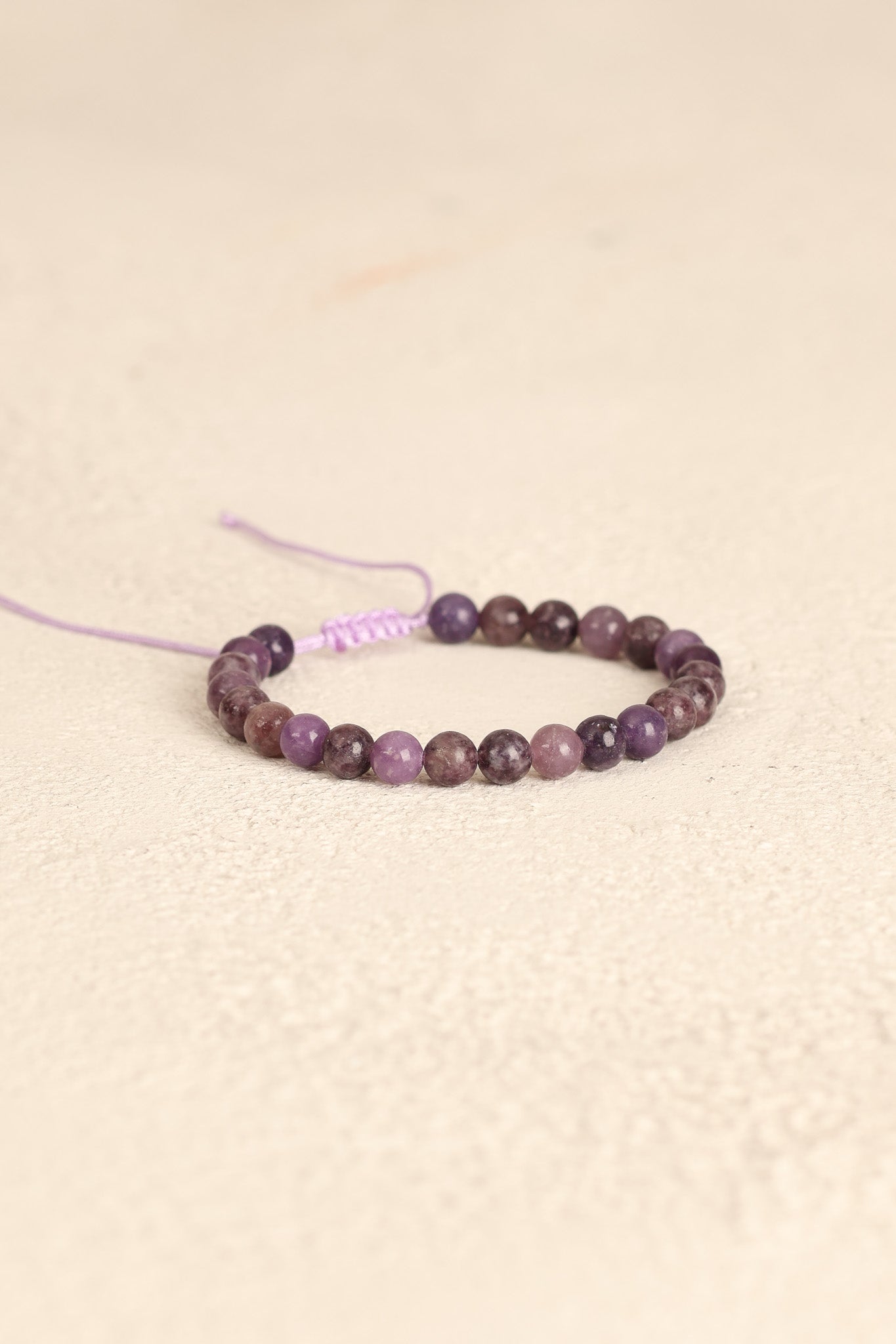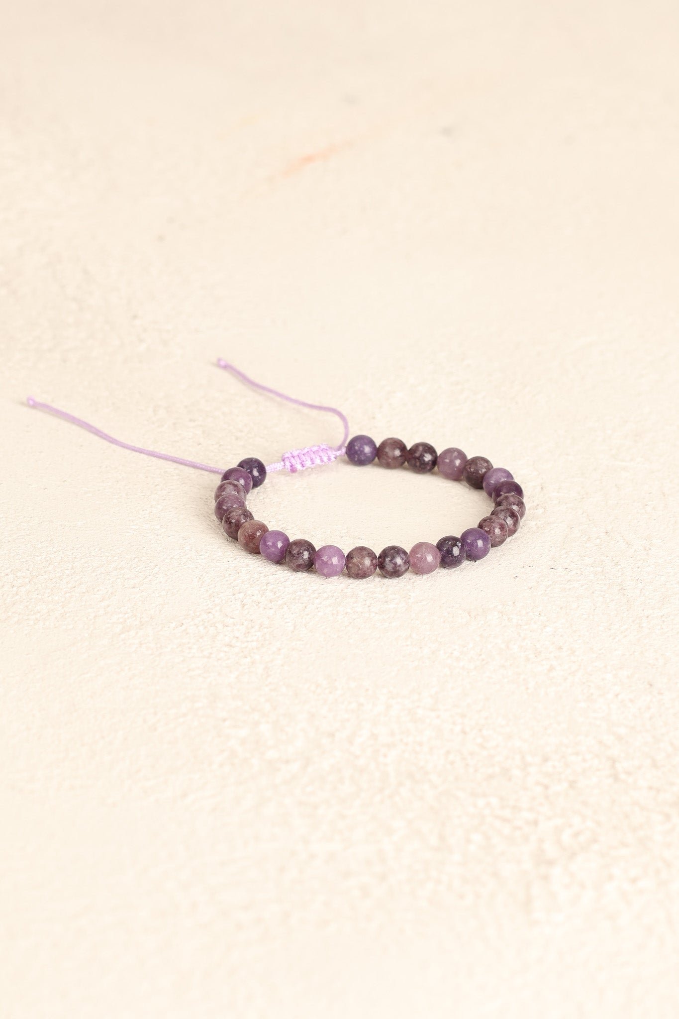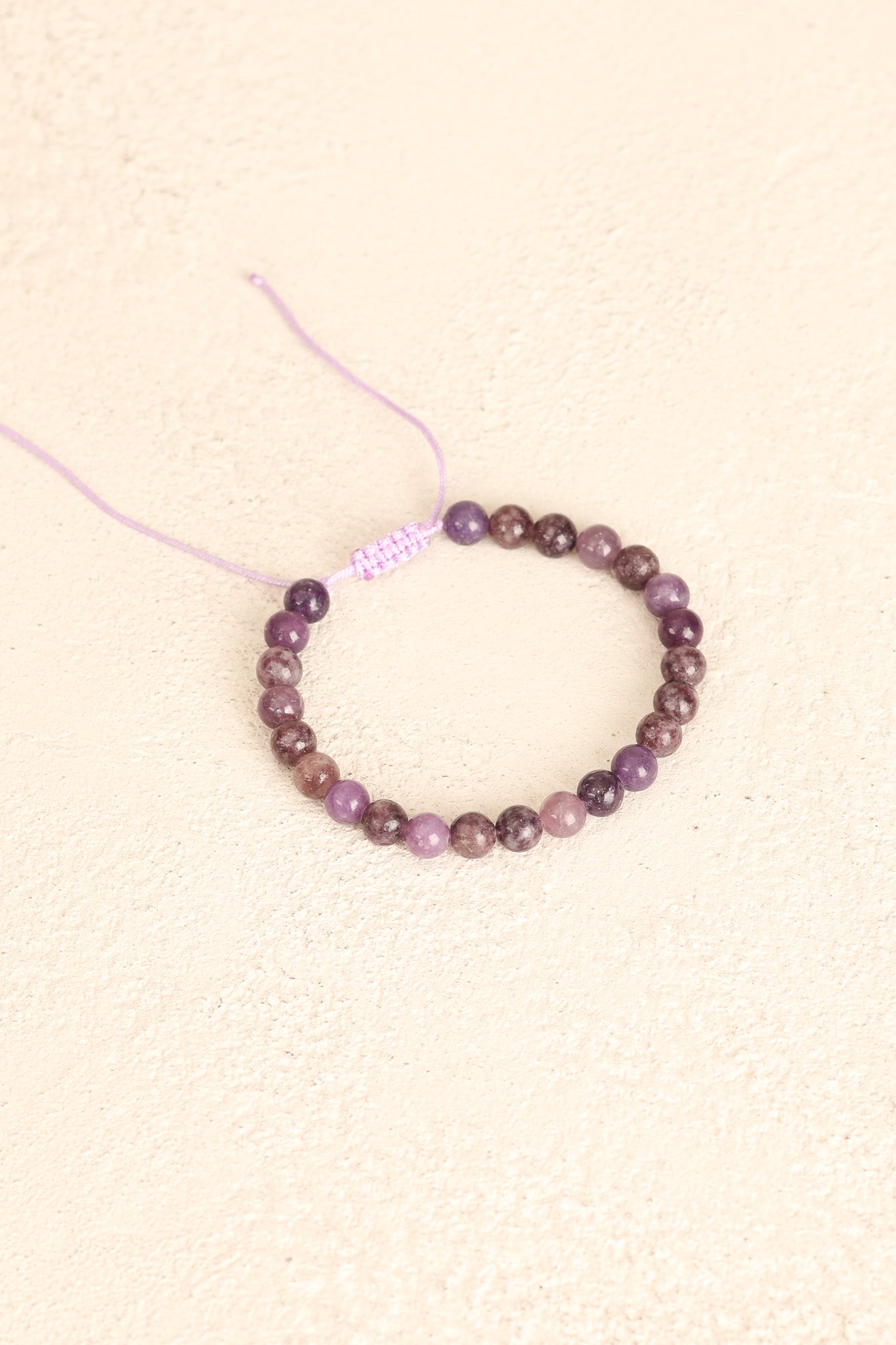 Lepidolit taşının mor ve lavanta tonlarındaki doğal yansımaları, ışığa göre farklı derinlikler oluşturur. El yapımı makrome örgü, hem dayanıklılığı hem de konforlu kullanımıyla öne çıkar. Günlük kombinlerde zarif, doğal ve dengeli bir görünüm sunar.