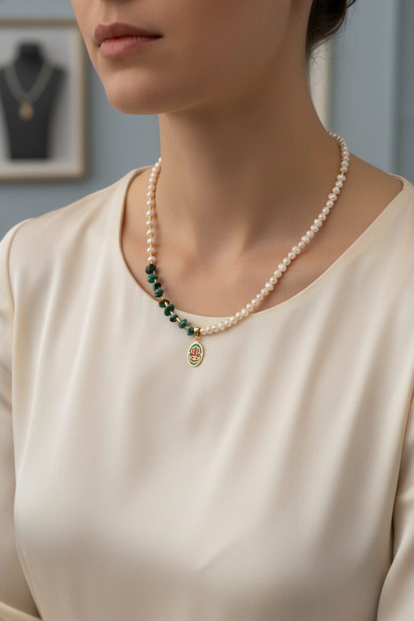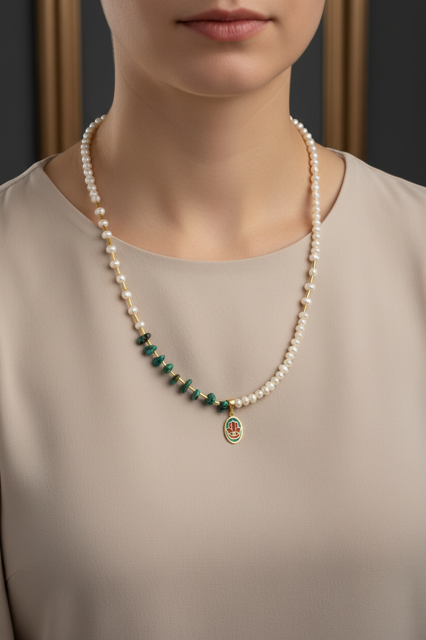 Mozaik turkuazın (firuza) canlı mavi tonları ile incinin zarif ışıltısı, 925 ayar gümüş detaylarla birleşerek sofistike bir kolye tasarımına dönüşüyor. El işçiliğiyle özenle hazırlanmış bu özel parça; günlük kombinlerde modern bir şıklık, özel günlerde ise zamansız bir tamamlayıcıdır. Doğal taşların uyumlu birleşimi, tasarıma özgün ve seçkin bir karakter kazandırır.