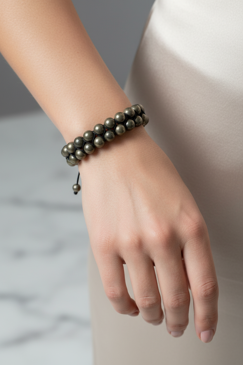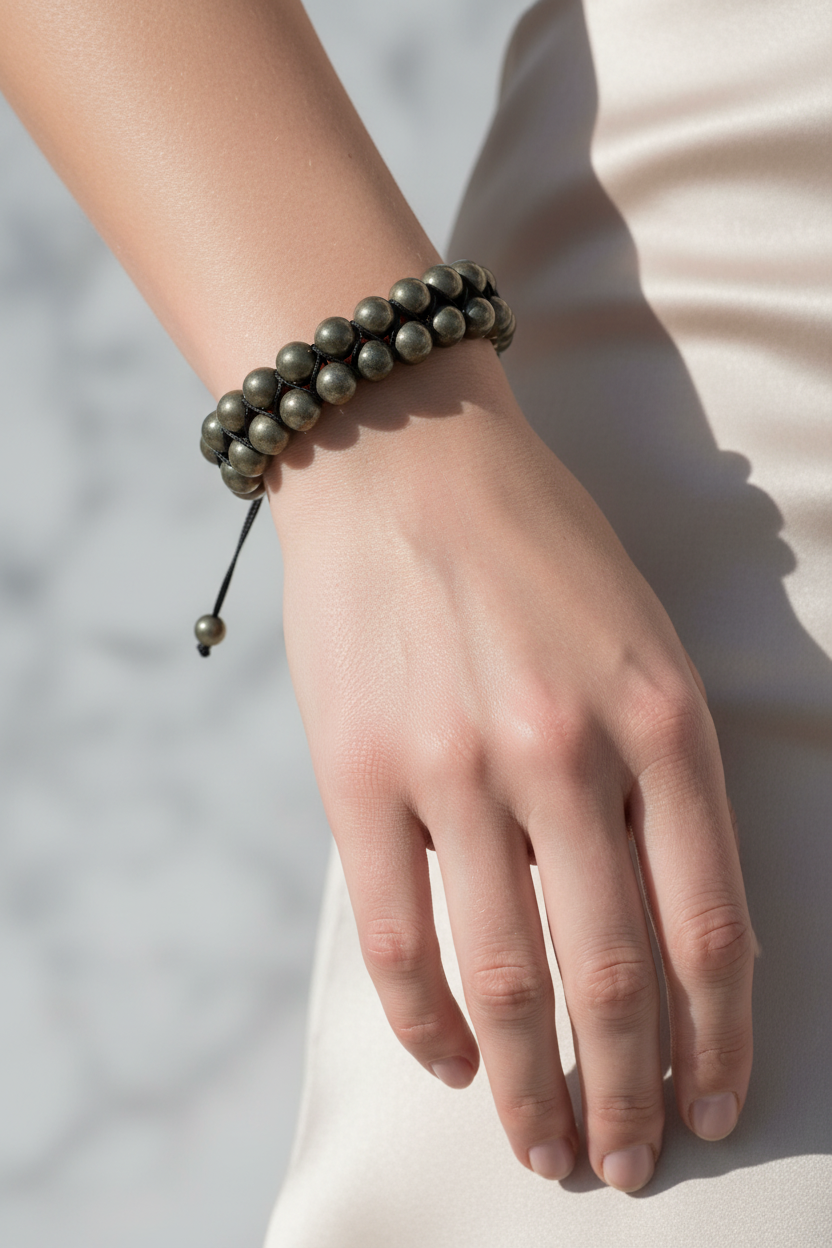 Altın gri metalik parlaklığıyla öne çıkan Pirit 8mm Çift Sıra Makrome Doğal Taş Bileklik, güçlü ve modern tasarımıyla bileğinizde karizmatik bir duruş sergiler. 8mm çapındaki doğal pirit taşları çift sıra halinde dizilmiş, el yapımı makrome örgü tekniğiyle hazırlanmıştır. Günlük kombinlerde iddialı bir detay katarken, özel davetlerde de sofistike bir tamamlayıcı aksesuar olarak tercih edilebilir.