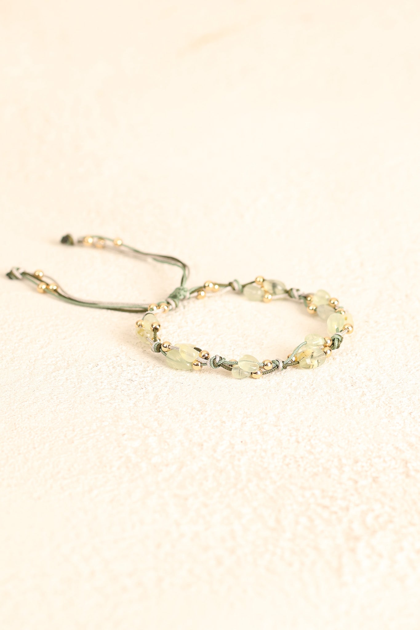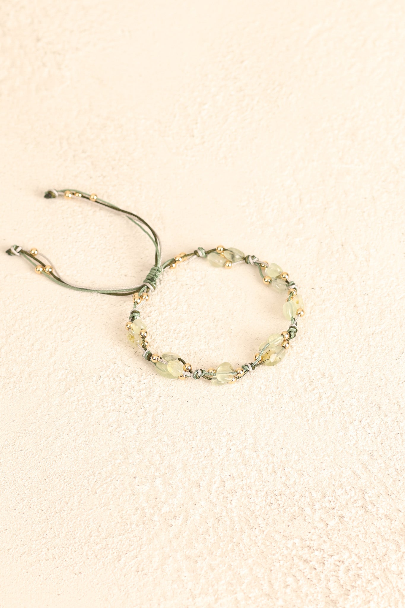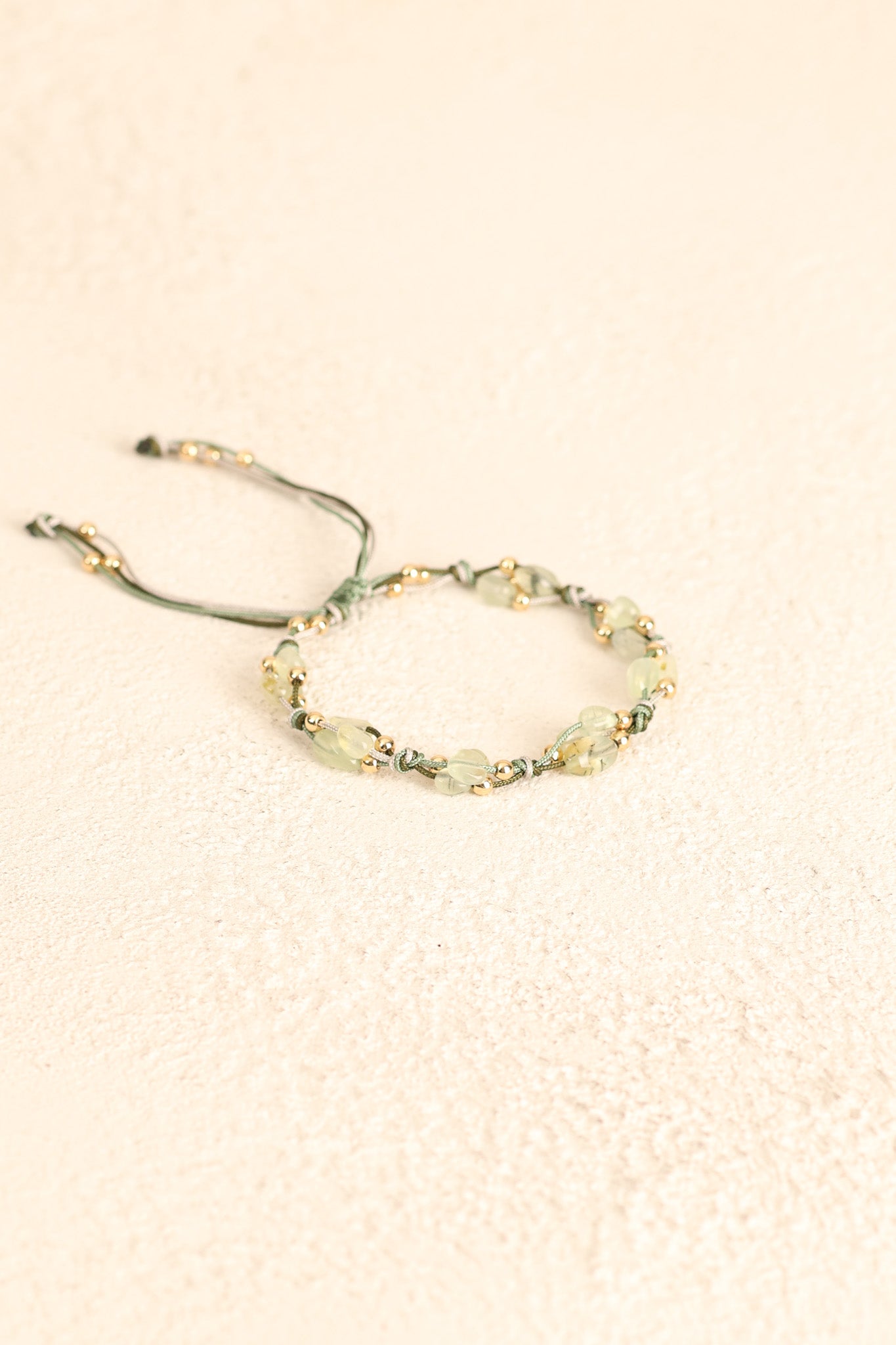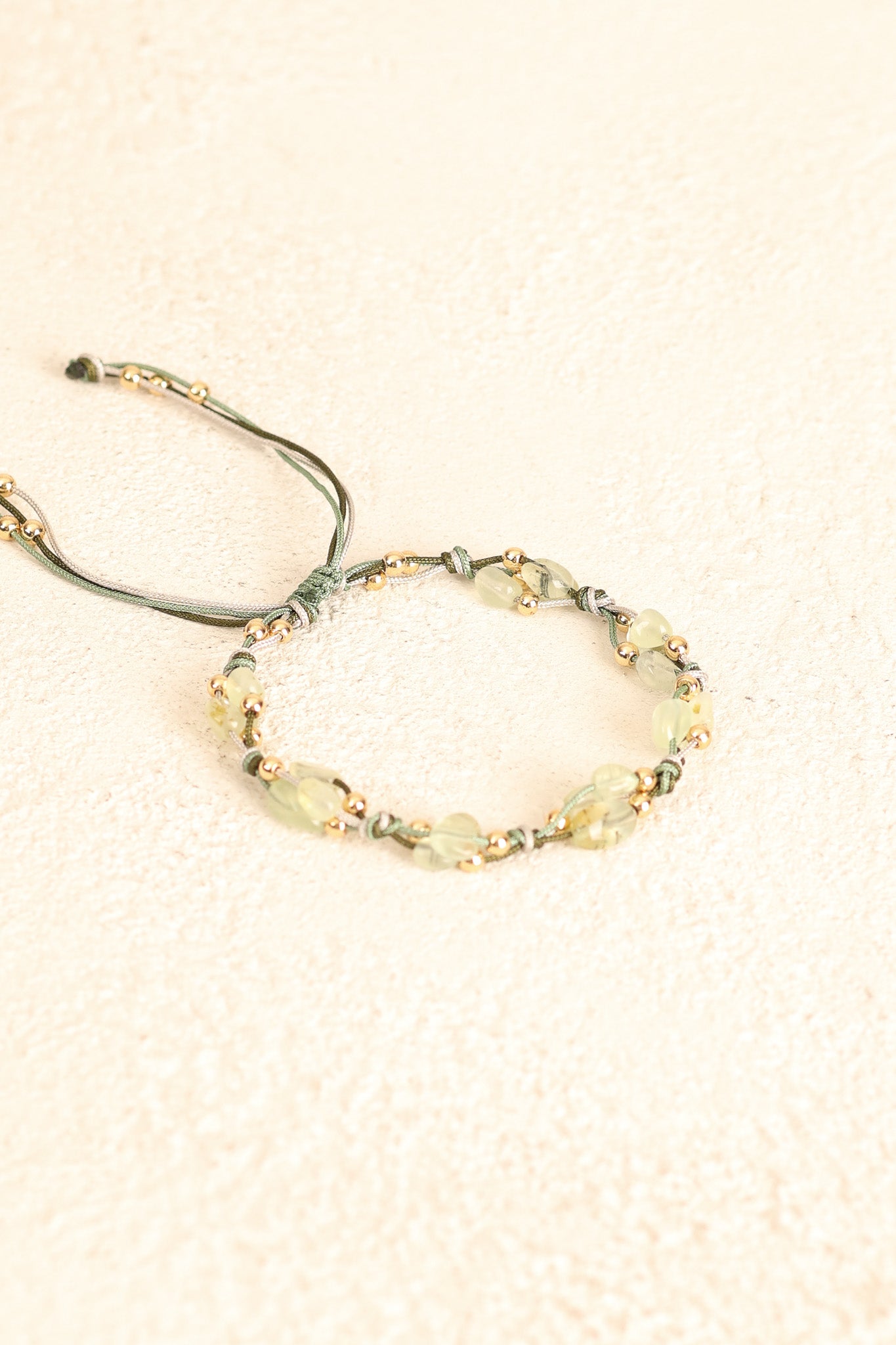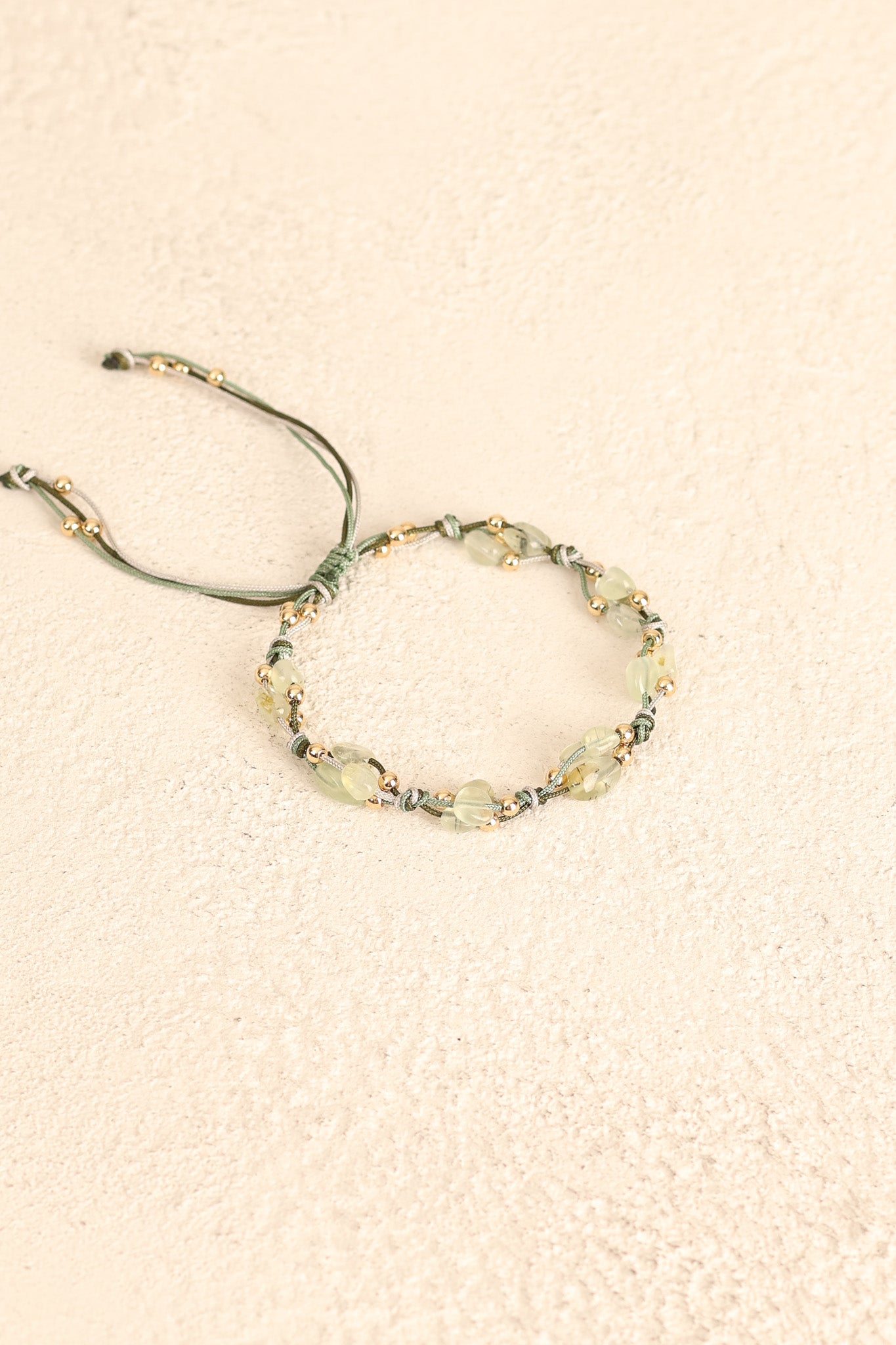 Doğal Prehnit taşının yumuşak yeşil tonlarıyla tasarlanan bu makrome bileklik, sade ama dikkat çekici bir zarafete sahiptir. El işçiliğiyle örülen dayanıklı makrome örgüsü, konforlu bir kullanım ve uzun ömürlü bir form sunar. Ayarlanabilir yapısı sayesinde farklı bilek ölçülerine kolayca uyum sağlar. Günlük kullanımlarda doğal bir stil, özel günlerde ise zarif bir tamamlayıcı aksesuar olarak öne çıkar.