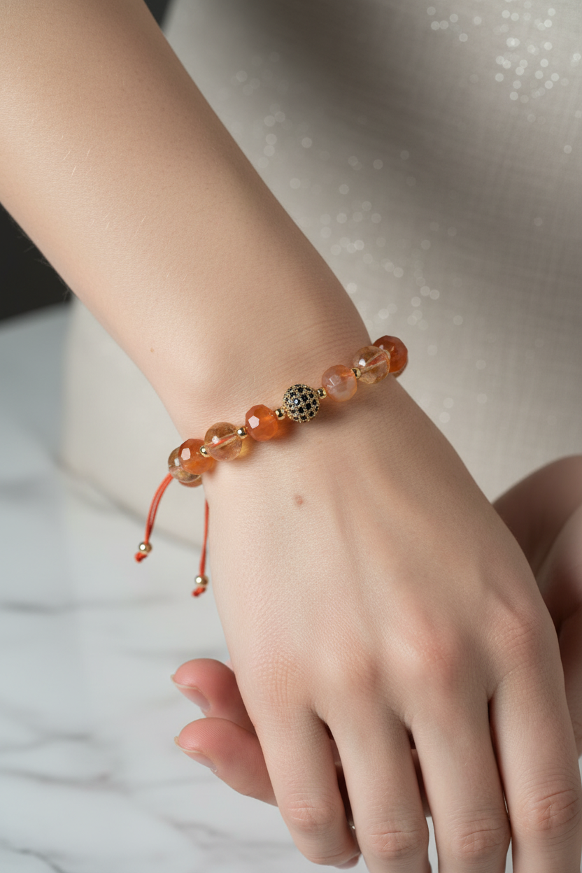 Akik taşının eşsiz damar desenlerini sitrinin sıcak ışıltısıyla buluşturan bu bileklik, koleksiyonuna zarif ve modern bir parça eklemek isteyenler için ideal seçimdir.