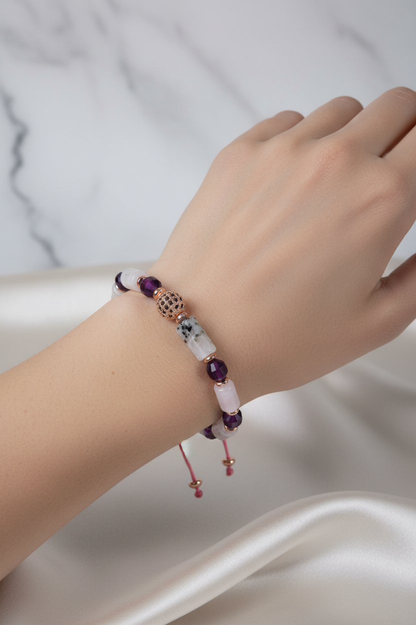 Ametistin zarif morunu, ay taşının büyüleyici parıltılarını ve pembe kuvarsın romantik tonlarını bir araya getiren bu bileklik; koleksiyonuna modern ve şık bir parça eklemek isteyenler için ideal seçimdir.