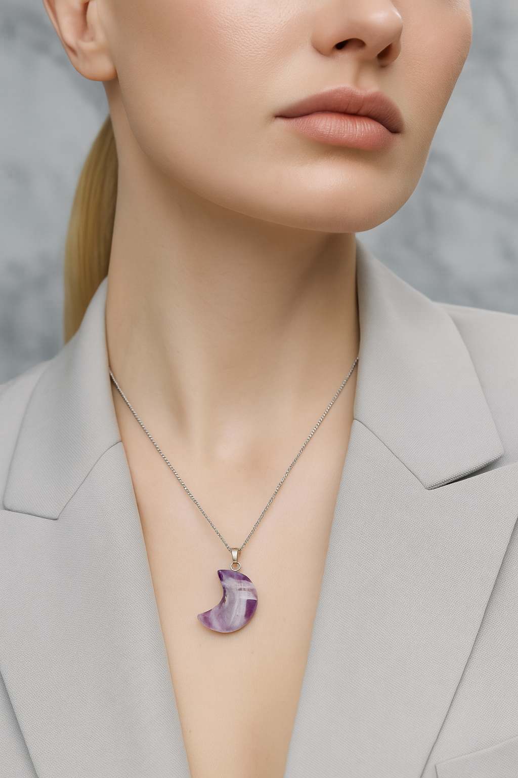 Sertifikalı Ametist Doğal Taş Ay Model Kolye