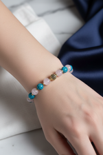 Apatitin canlı mavisini, pembe kuvarsın yumuşak tonları ve hematitin güçlü parlaklığıyla buluşturan bu bileklik; koleksiyonuna modern ve sofistike bir parça eklemek isteyenler için ideal seçimdir.