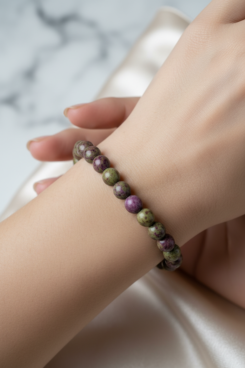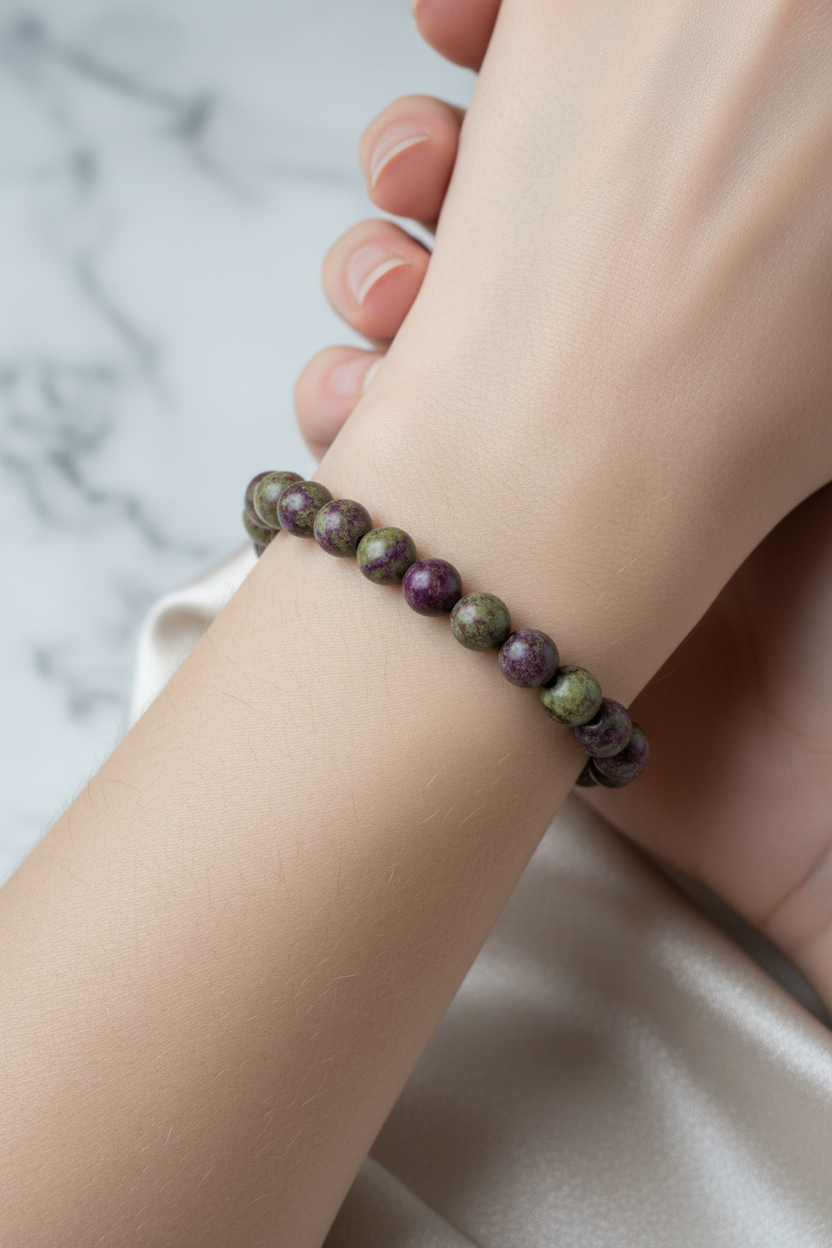 Atlantisit Bileklik, doğal taş severler için şık ve özel bir tasarım sunar. Avustralya kökenli olan Atlantisit taşı; yeşil serpantin ve mor stichtit minerallerinin birleşiminden oluşur. Hem doğal görünümü hem de farklı renk uyumu sayesinde günlük kullanımda zarif bir aksesuar olarak öne çıkar.