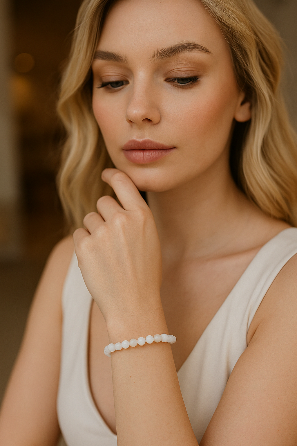 Süt beyazı, krem ve opak tonlarında yumuşak bir parlaklık sunan ay taşı, bu özel bileklikte 6 mm yuvarlak kesim formunda dizilmiş ve zarif bir tasarımla tamamlanmıştır. Işıkla birlikte taş yüzeyinde beliren inci yansımaları, bilekte nazik ve huzurlu bir görünüm oluşturur.