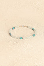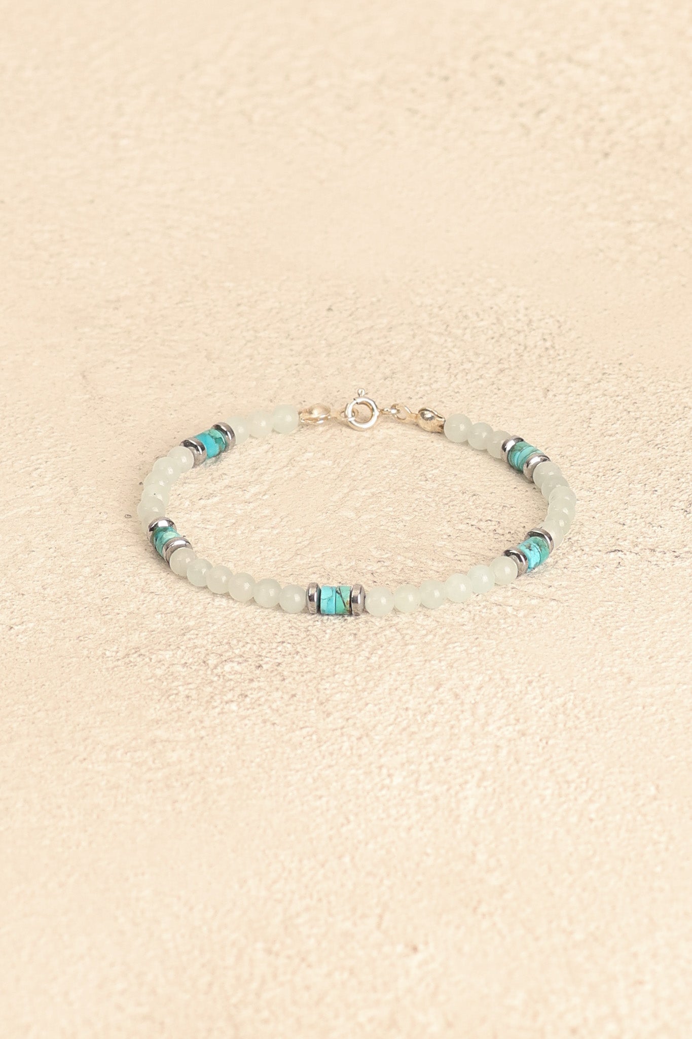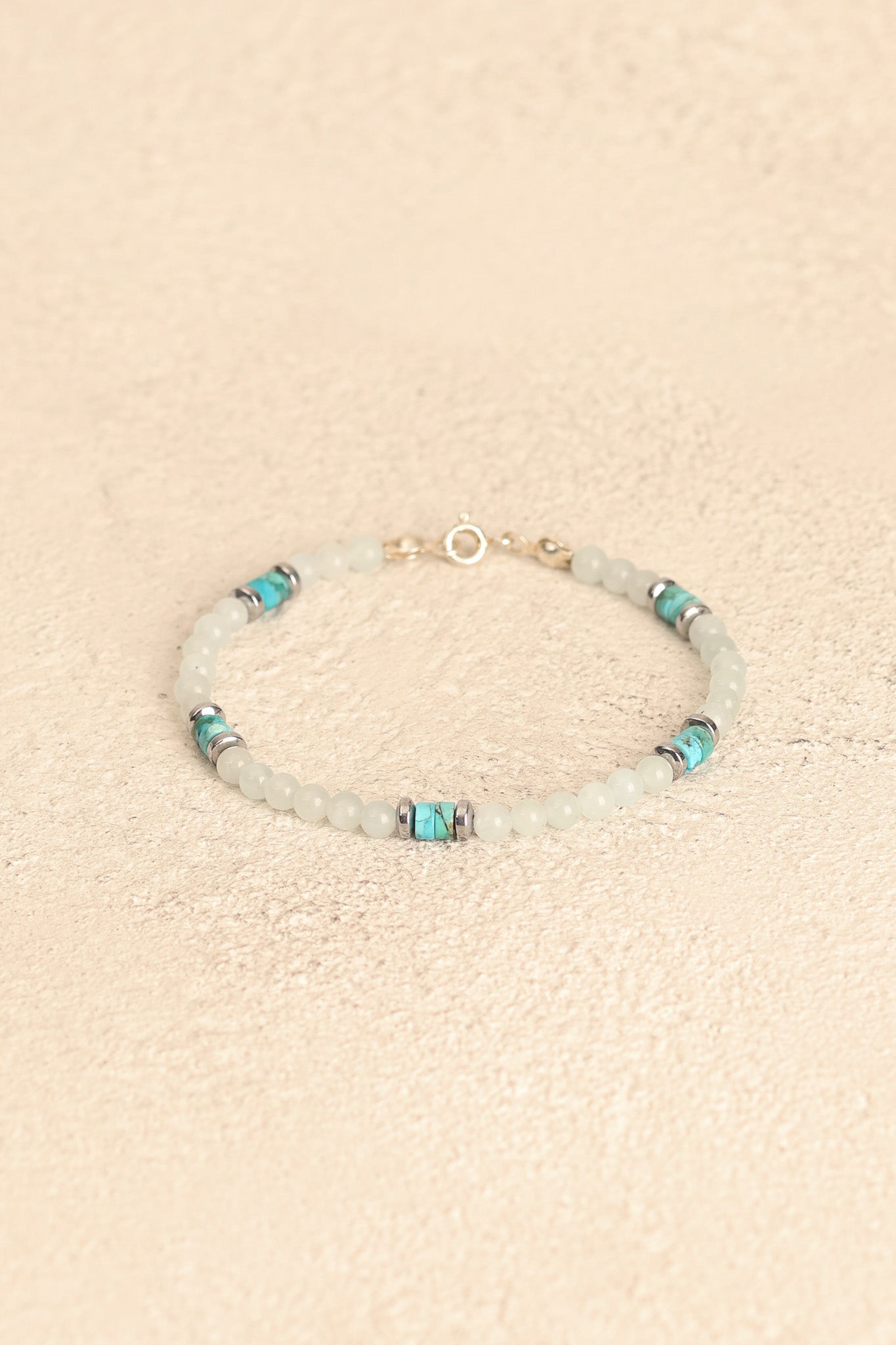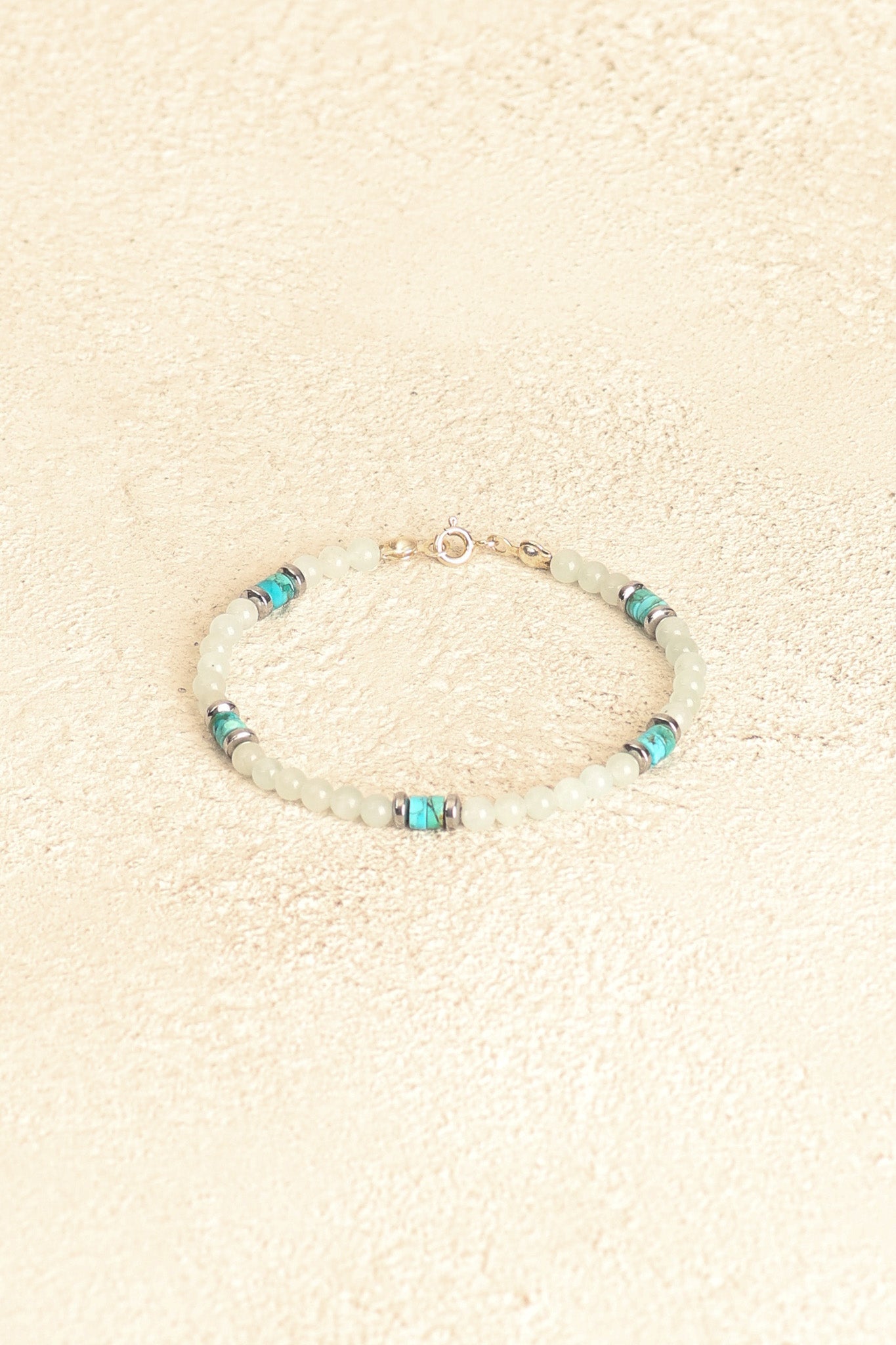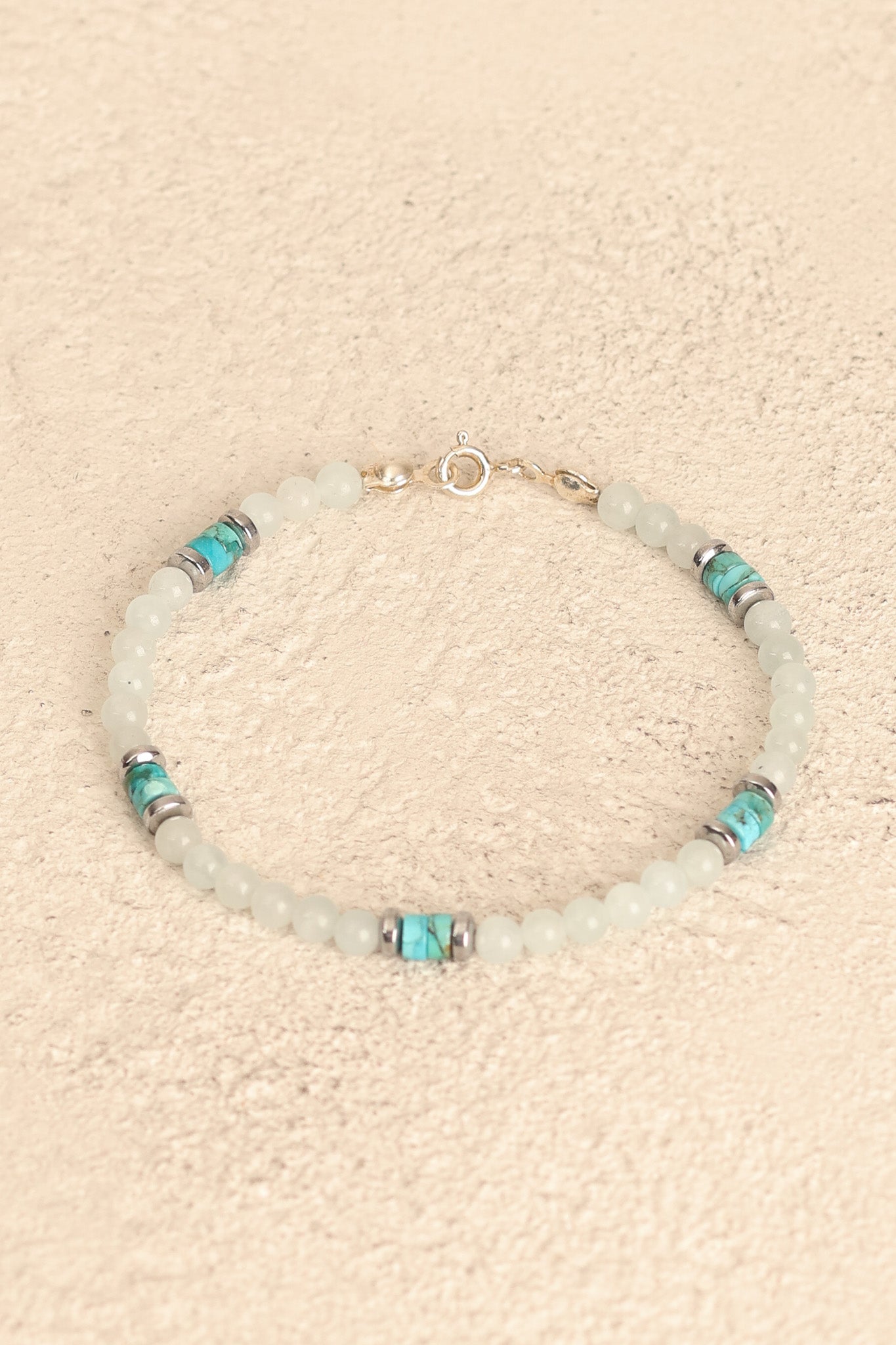 Doğanın üç farklı taşını zarif bir şekilde bir araya getiren bu özel bileklik; ışıltılı ay taşı, metalik parlaklığa sahip hematit ve canlı mavi tonlarıyla öne çıkan turkuaz taşlarından oluşur.