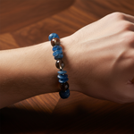 Dumanlı kuvarsın yarı saydam gri tonları, kyanitin derin mavi rengi ve hematitin metalik gri parlaklığı bu bileklikte buluşarak sofistike bir uyum sunuyor. Doğal taşların kontrast birlikteliği, bilekliğe hem modern hem de karakterli bir görünüm kazandırıyor.