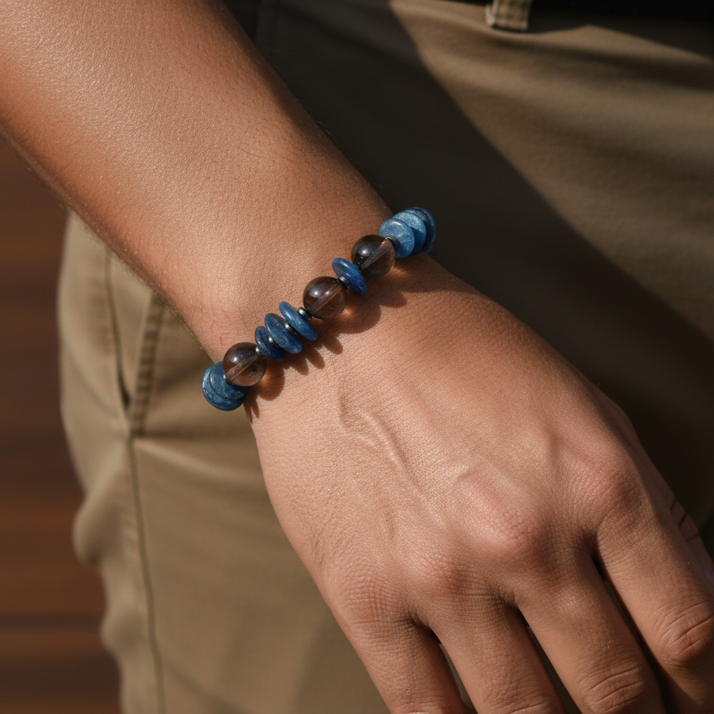 Dumanlı kuvarsın zarif dokusu, kyanitin göz alıcı mavisi ve hematitin güçlü ışıltısını bir araya getiren bu bileklik, koleksiyonuna modern ve sofistike bir parça eklemek isteyenler için ideal bir seçimdir.
