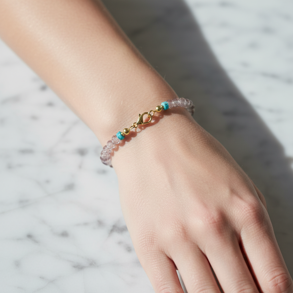 Dumanlı kuvars ve turkuaz taşlarının uyumuyla tasarlanan bu doğal taş bileklik, modern ve şık görünümüyle öne çıkar. El işçiliğiyle özenle hazırlanmış olan tasarım, günlük kullanımda ve özel günlerde stilinizi tamamlayan estetik bir aksesuardır.