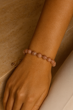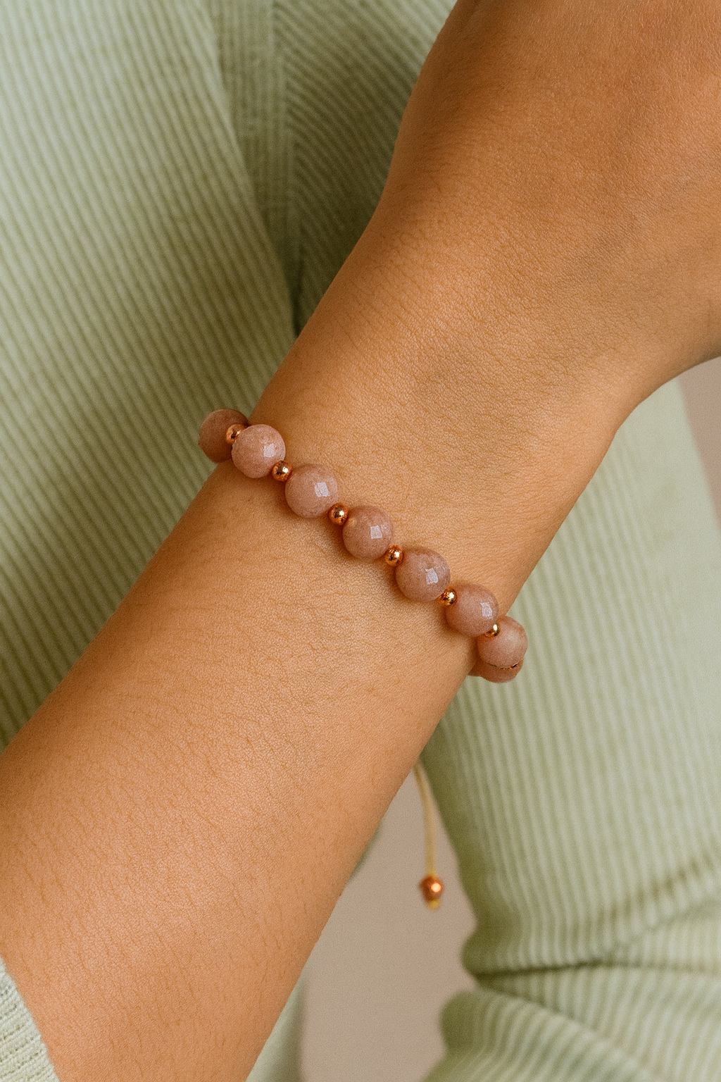 Güneş taşı ve hematit taşlarının uyumlu birleşiminden tasarlanan bu makrome bileklik, modern ve zarif görünümüyle dikkat çeker. El işçiliğiyle hazırlanan makrome örgü, dayanıklılığı ve konforlu kullanımı bir arada sunar.