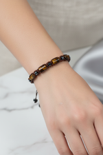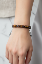 Kaplan gözünün altın-kahverengi ışıltısı ile hematitin metalik gri parlaklığı bu bileklikte güçlü bir uyum sergiliyor. Köşeli makrome modeliyle örülmüş ipli tasarım, dayanıklı yapısı ve ayarlanabilir formu sayesinde farklı bilek ölçülerine kolayca uyum sağlar. Günlük kullanımda sade bir şıklık, özel günlerde ise sofistike bir tamamlayıcı aksesuar olarak öne çıkar.