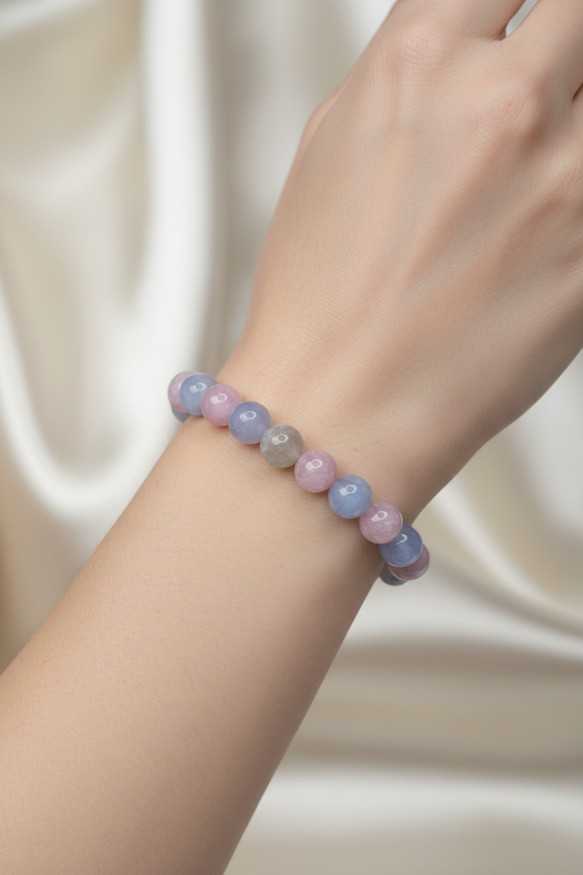 Kunzit taşının zarif pembe-mor tonları ile mavi akik taşının doğal desenleri bu bileklikte buluşarak sofistike bir uyum sunuyor. 10 mm boyutundaki doğal taşlarla tasarlanmış misinalı form, bileğe rahatça oturur ve günlük kullanıma konfor katar.