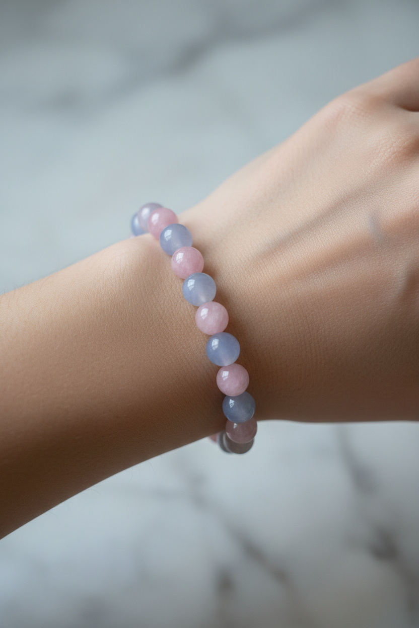 Kunzitin yumuşak pembesini ve mavi akikin zarif tonlarını bir araya getiren bu 10 mm misinalı bileklik; koleksiyonuna modern, şık ve dikkat çekici bir parça eklemek isteyenler için ideal seçimdir.