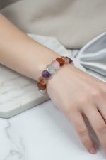 Pembe kuvarsın romantik pembesi, ametistin asil moru, sitrinin bal sarısı ışıltısı, akuamarinin ferahlatıcı mavisi, jasperın toprak tonları, güneş taşının sıcak parıltısı ve ay taşının mistik yansımaları bu bileklikte zarif bir uyum oluşturuyor. Rolex model dizilimle hazırlanmış misinalı form, bileğe konforlu bir oturuş sağlarken modern bir görünüm kazandırıyor.