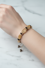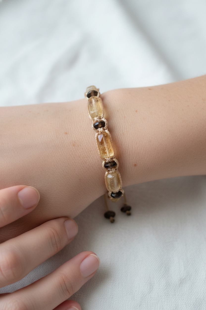 Sitrin taşının bal sarısı ışıltısı ile hematitin metalik gri parlaklığı bu bileklikte zarif bir uyum oluşturuyor. Köşeli makrome modeliyle örülen ipli tasarım, sağlam yapısı ve ayarlanabilir formu sayesinde farklı bilek ölçülerine kolayca uyum sağlar. Günlük kullanımda zarif bir şıklık, özel günlerde ise sofistike bir tamamlayıcı aksesuar olarak öne çıkar.
