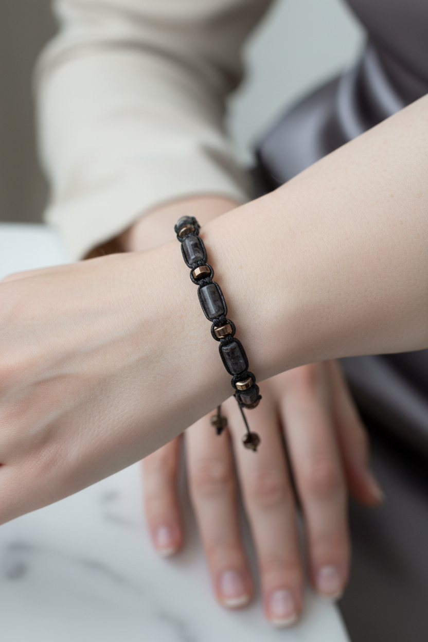 Spektrolitin büyüleyici ışık oyunlarını hematitin güçlü parlaklığıyla buluşturan bu köşeli makrome ipli bileklik; koleksiyonuna modern, zarif ve karakterli bir parça eklemek isteyenler için ideal seçimdir.