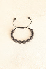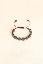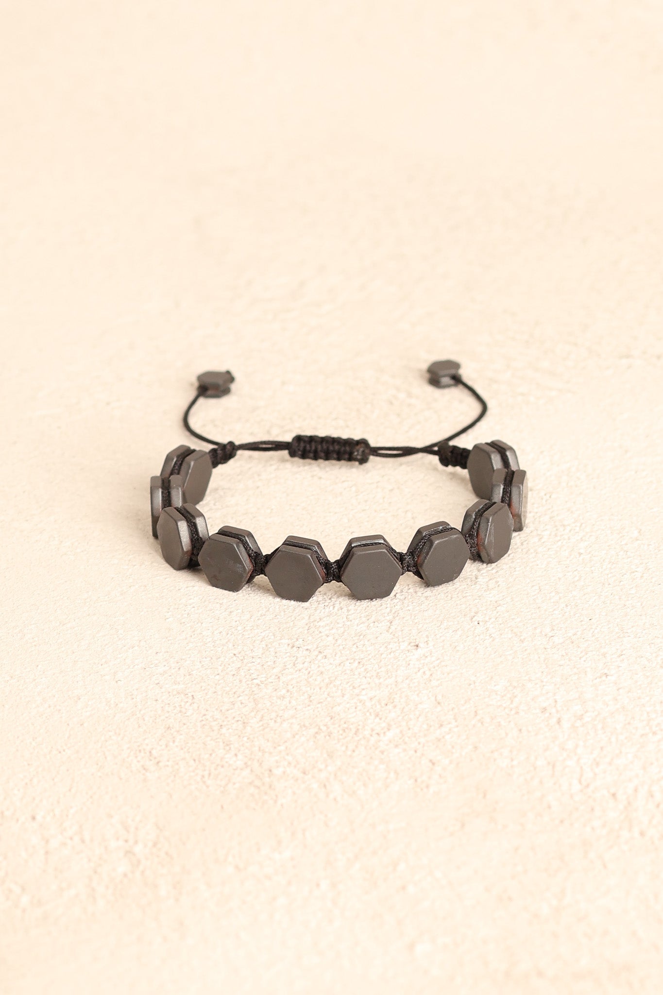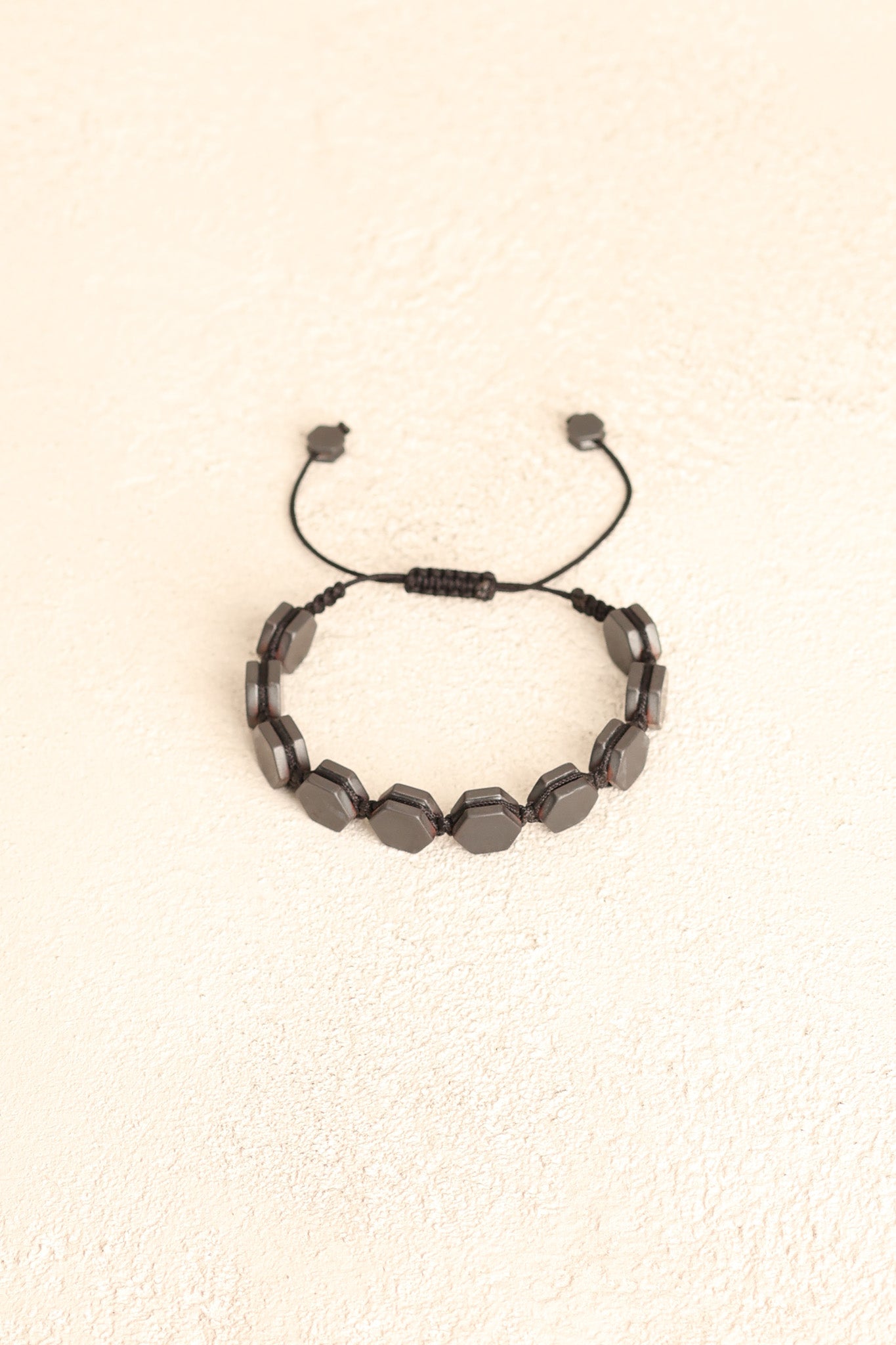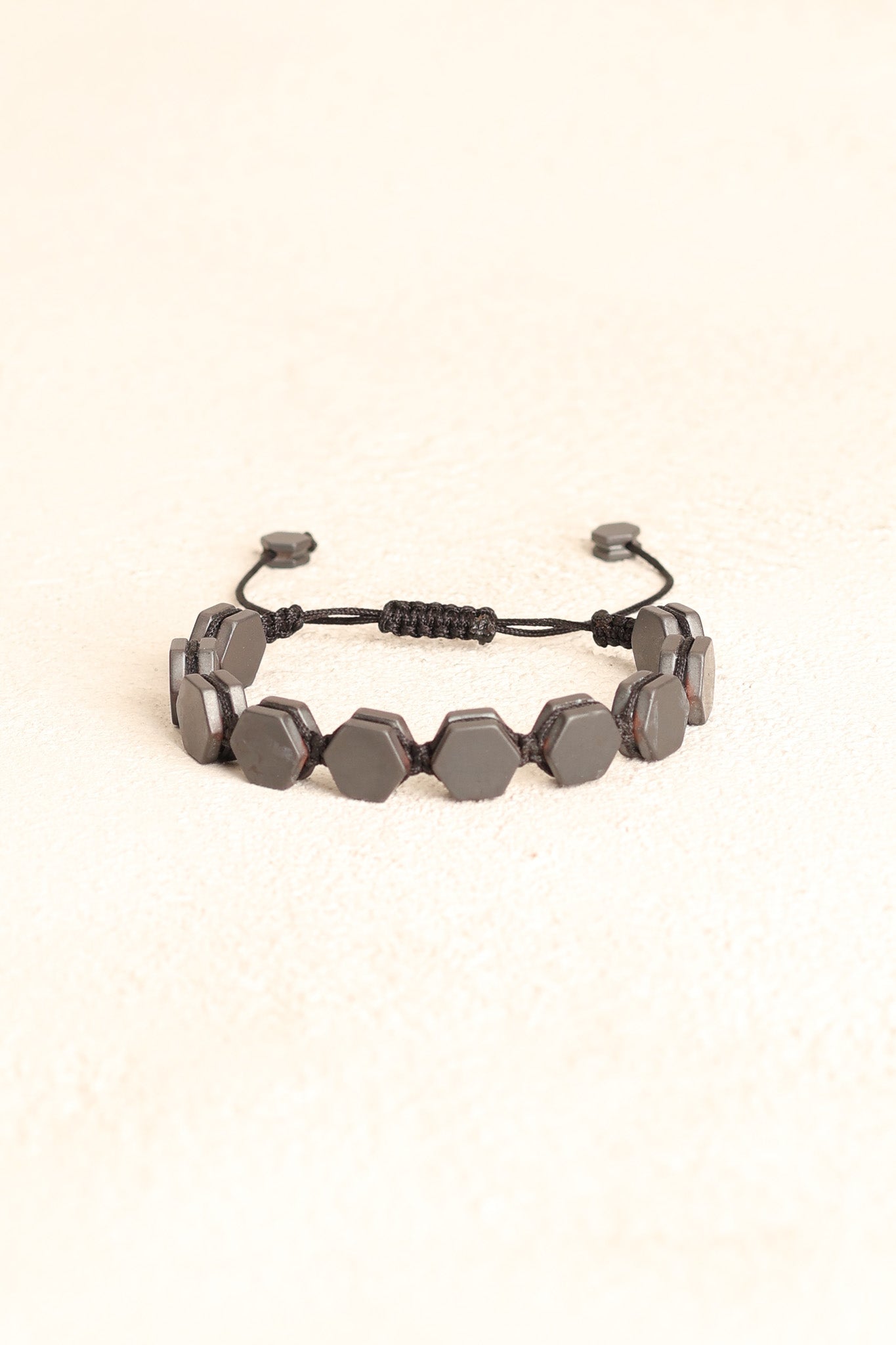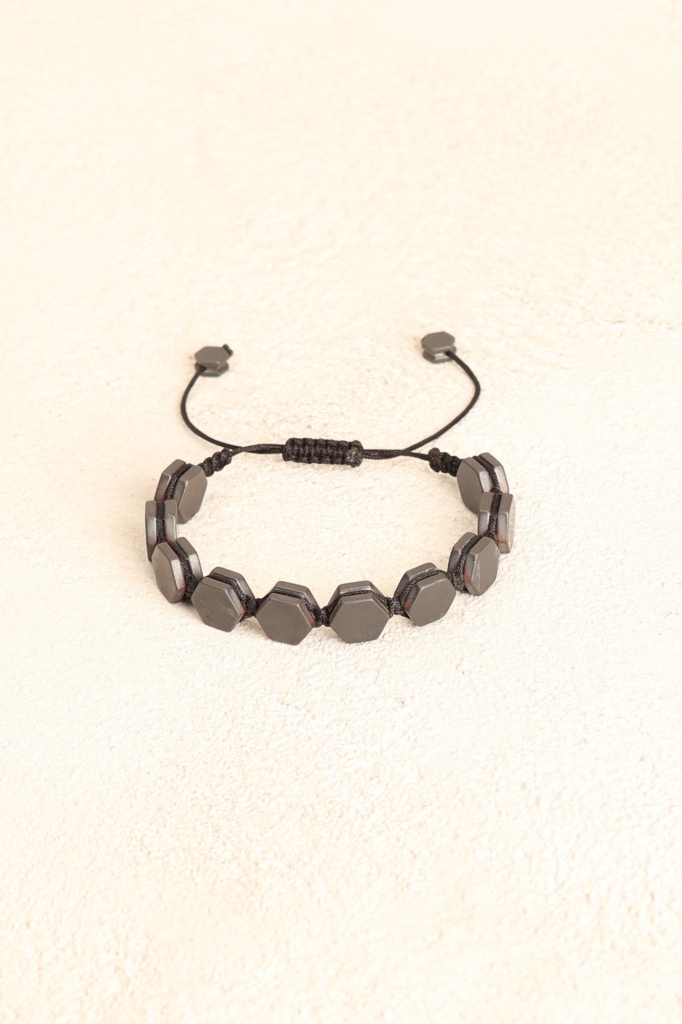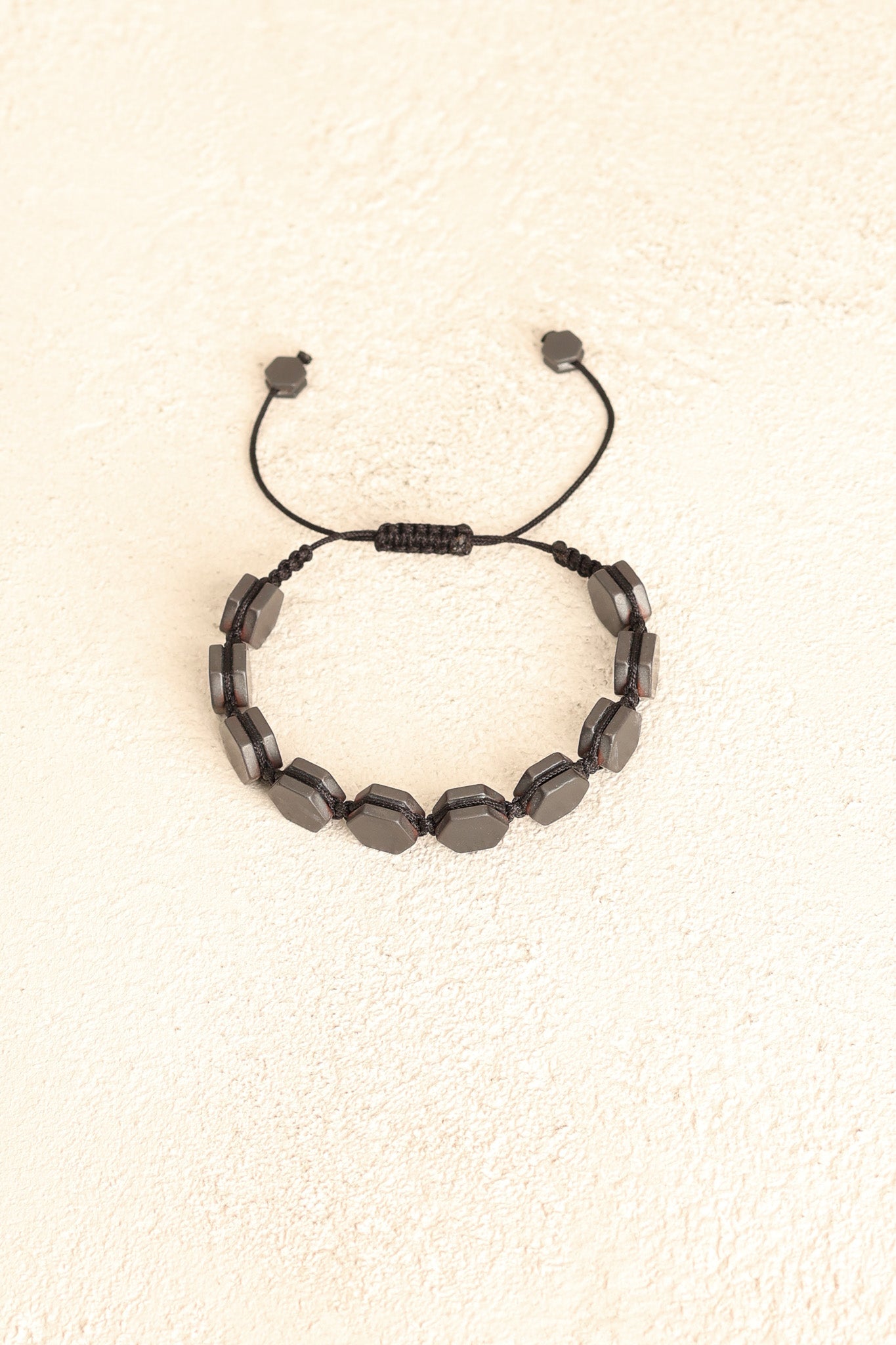 Metalik gri parlaklığıyla dikkat çeken %100 doğal hematit taşları, el işçiliğiyle örülmüş makrome tasarımda modern bir bileklik formuna kavuştu.