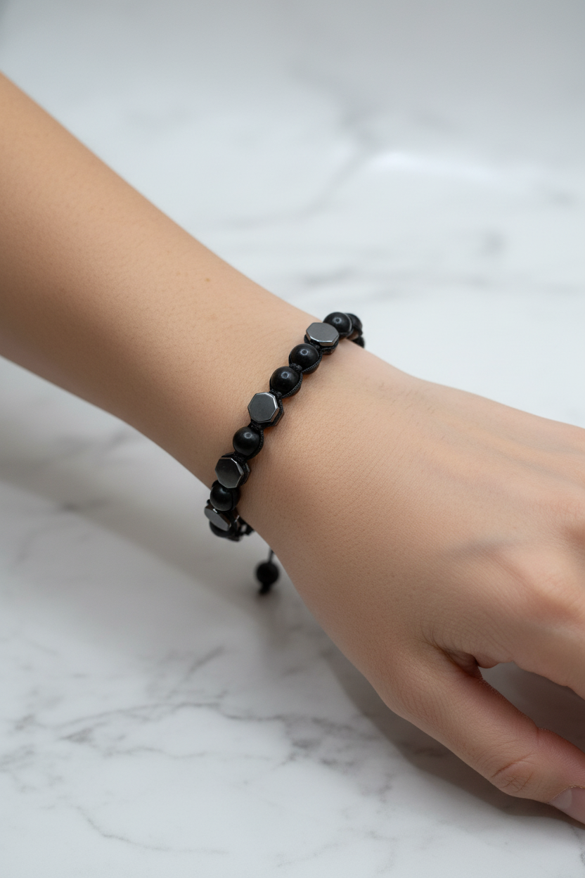 Hematit & Şungit Doğal Taş Makrome Bileklik, doğal taşların güçlü duruşunu modern makrome işçiliğiyle buluşturan özel bir aksesuardır. Gri metalik parıltısıyla hematit taşı ve siyah tonlarıyla öne çıkan şungit taşı, bilekte şık ve dikkat çekici bir uyum sergiler. Ayarlanabilir makrome yapısı sayesinde hem kadınlar hem erkekler için kullanışlı ve konforlu bir seçimdir.