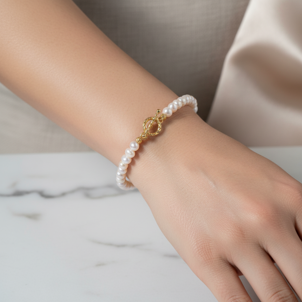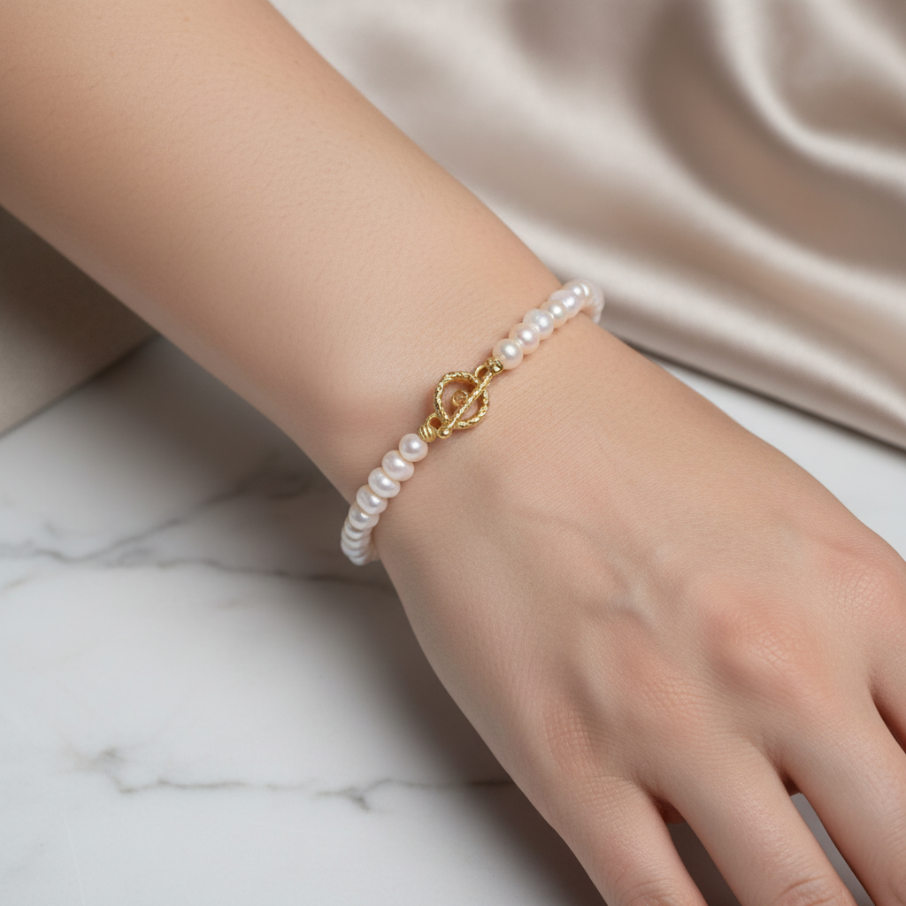 Doğal incilerin zarif dokusuyla tasarlanan bu bileklik, altın kaplama gümüş aparat detayıyla şıklığını ön plana çıkarır. El işçiliğiyle özenle hazırlanmış tasarım, hem günlük kullanımda hem de özel günlerde modern bir tamamlayıcıdır.
