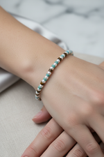 İnci, kaplan gözü ve turkuaz taşlarının zarif uyumuyla tasarlanan bu doğal taş bileklik, gümüş kapama detayıyla şıklığını ön plana çıkarır. El işçiliğiyle özenle hazırlanmış olan tasarım, günlük kullanımda ve özel günlerde stilinizi tamamlayan estetik bir aksesuardır.
