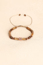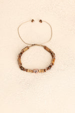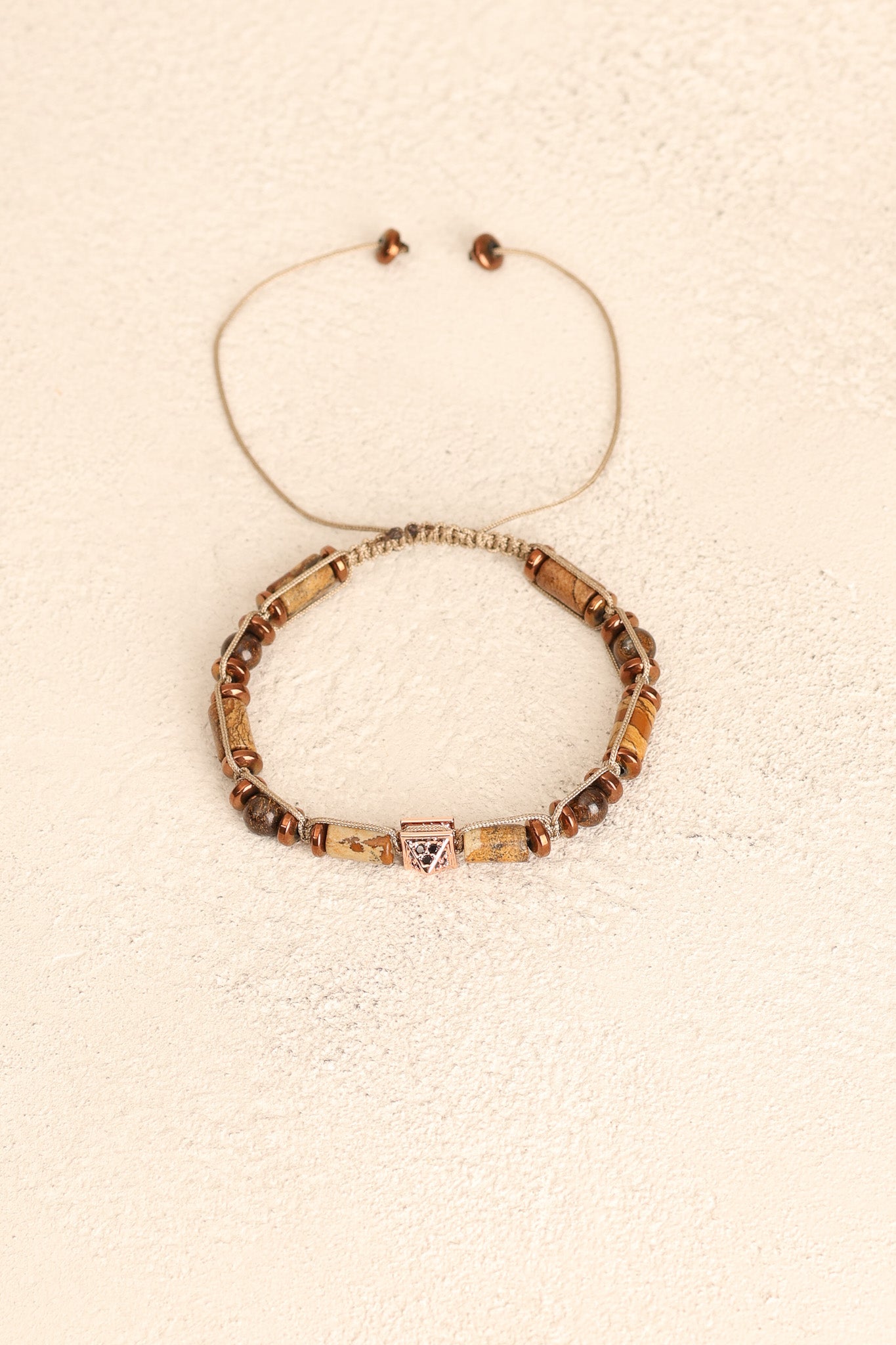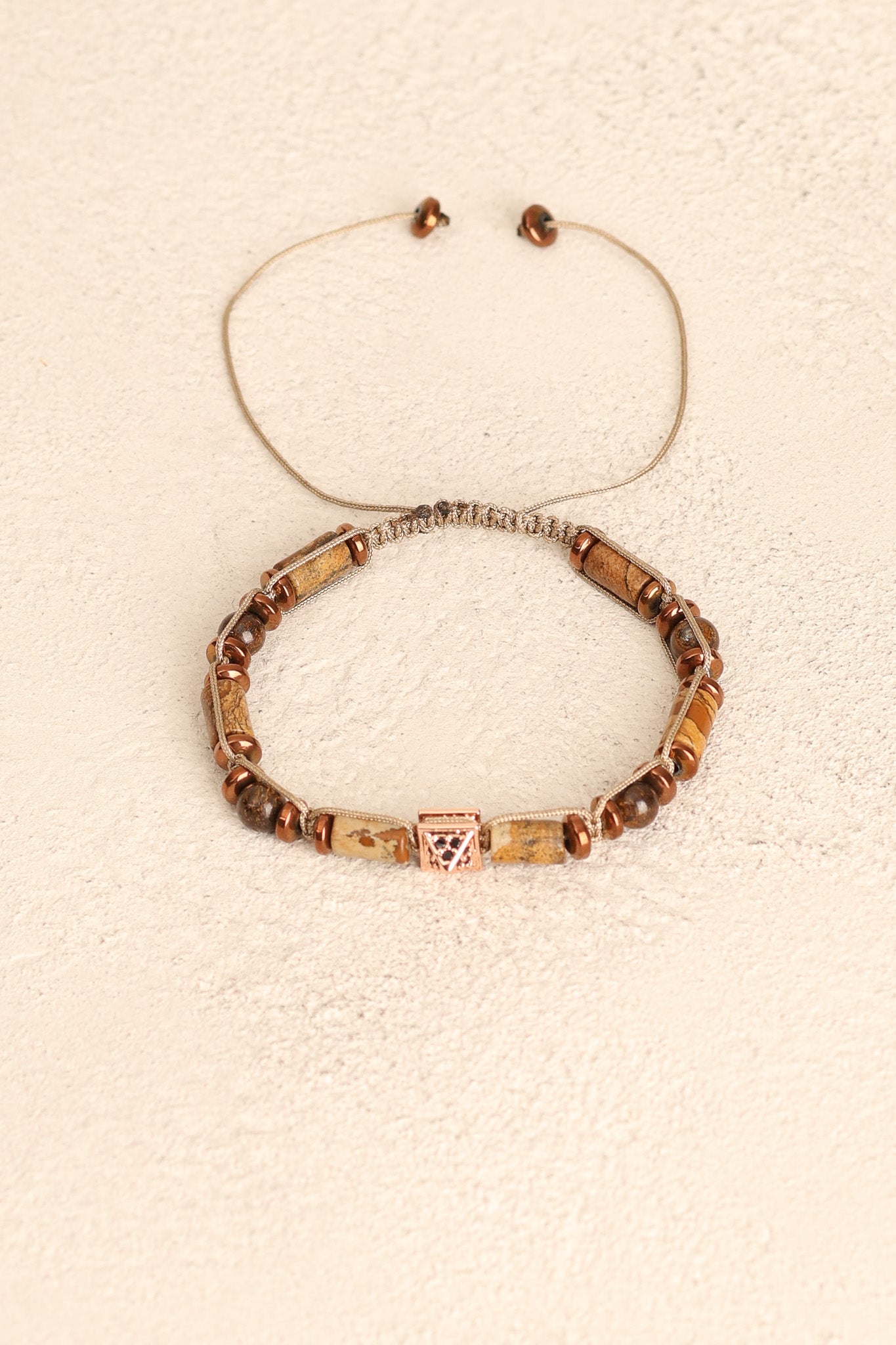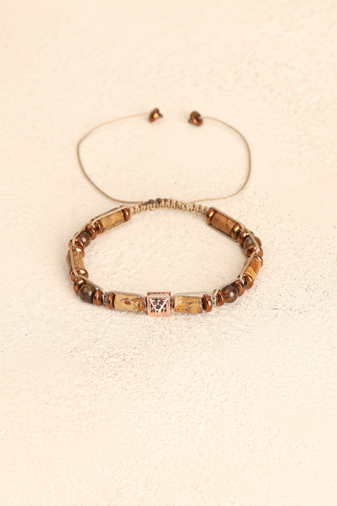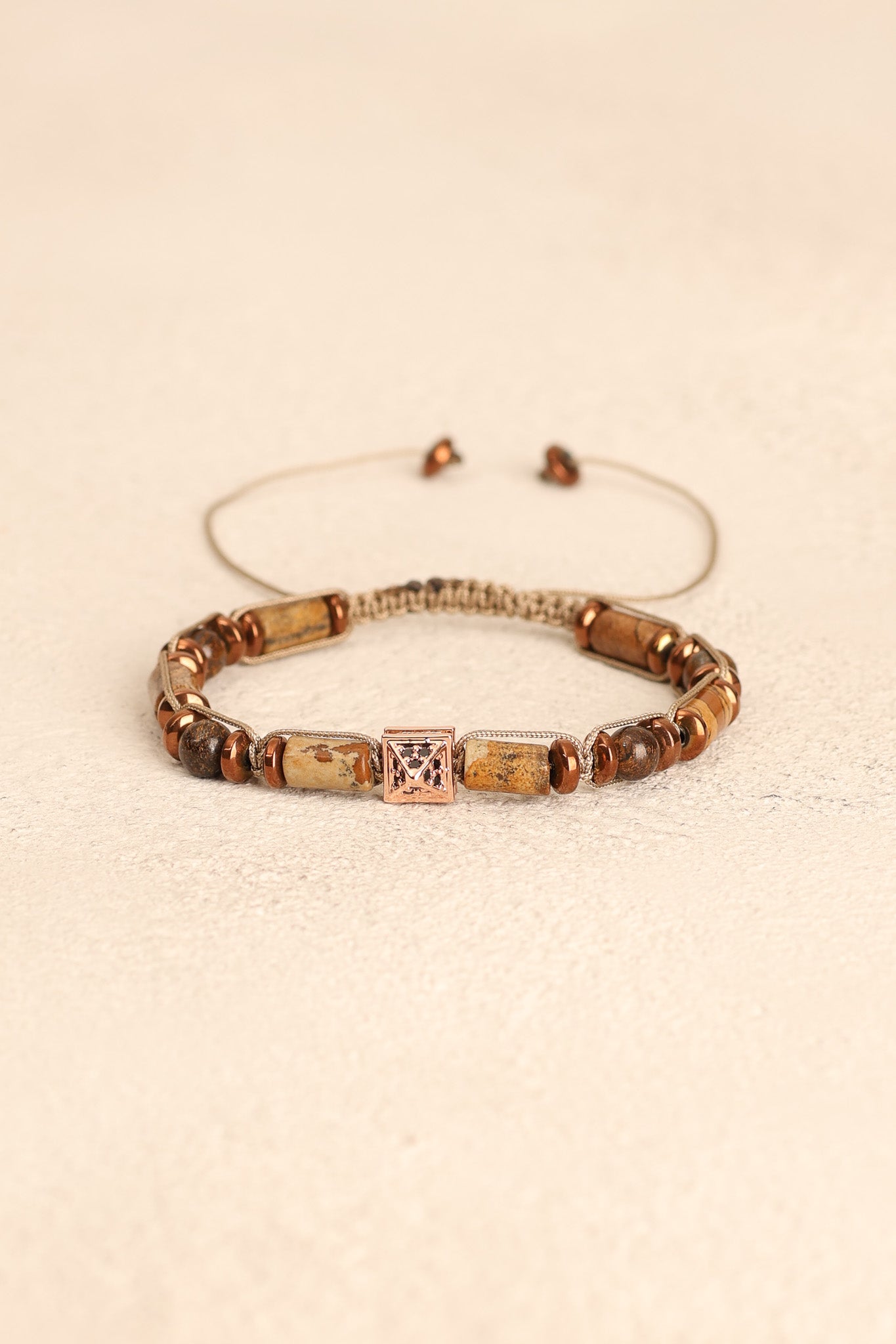 Toprak tonlarının sıcaklığıyla öne çıkan jasper, kahverenginin metalik parlak dokusunu yansıtan bronzit ve gri parlaklığıyla modern bir görünüm sunan hematit taşları; el işçiliğiyle örülmüş makrome tasarımda şık bir bütünlük kazandı.