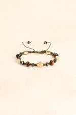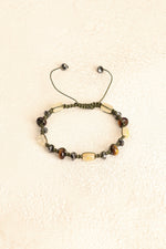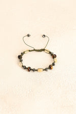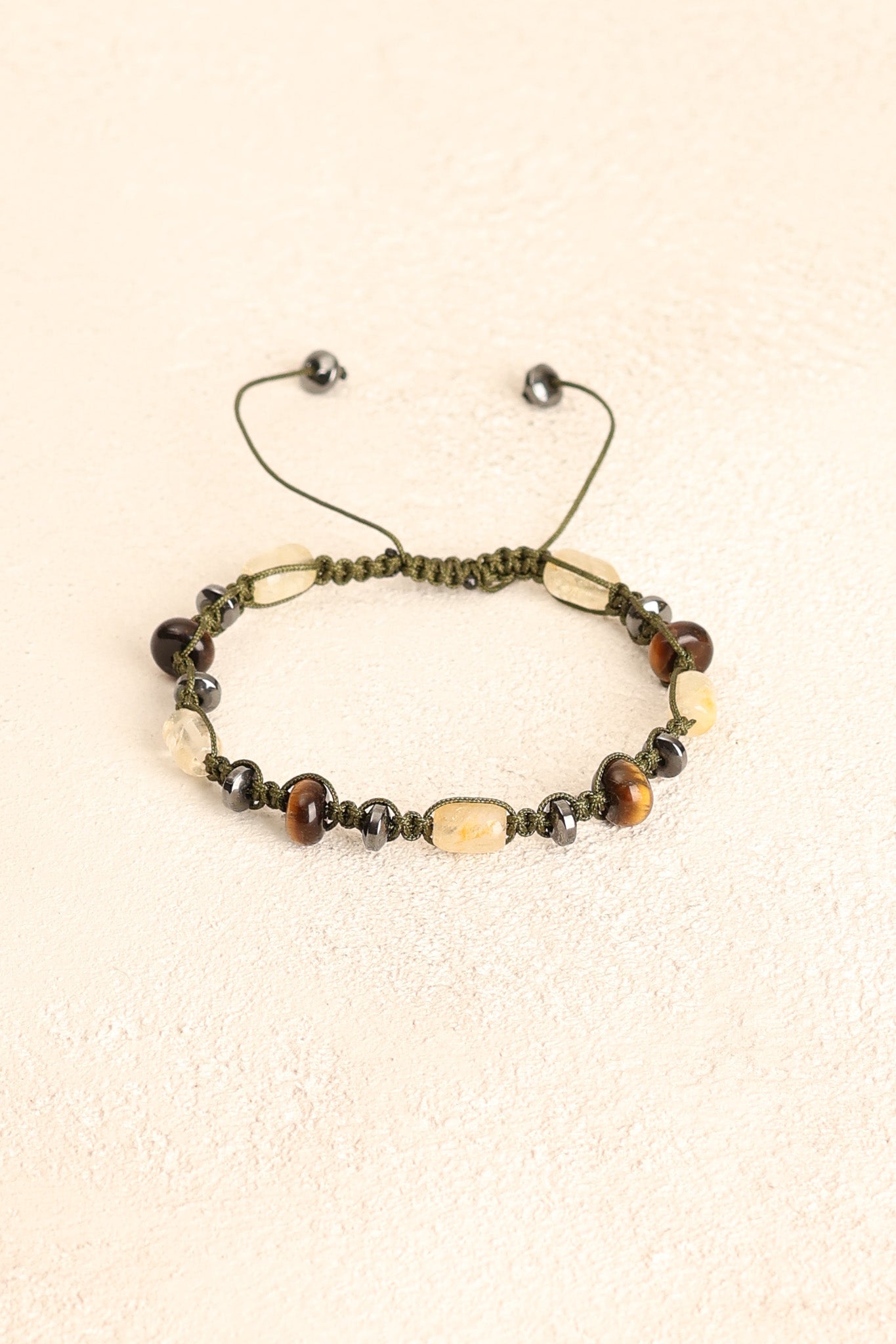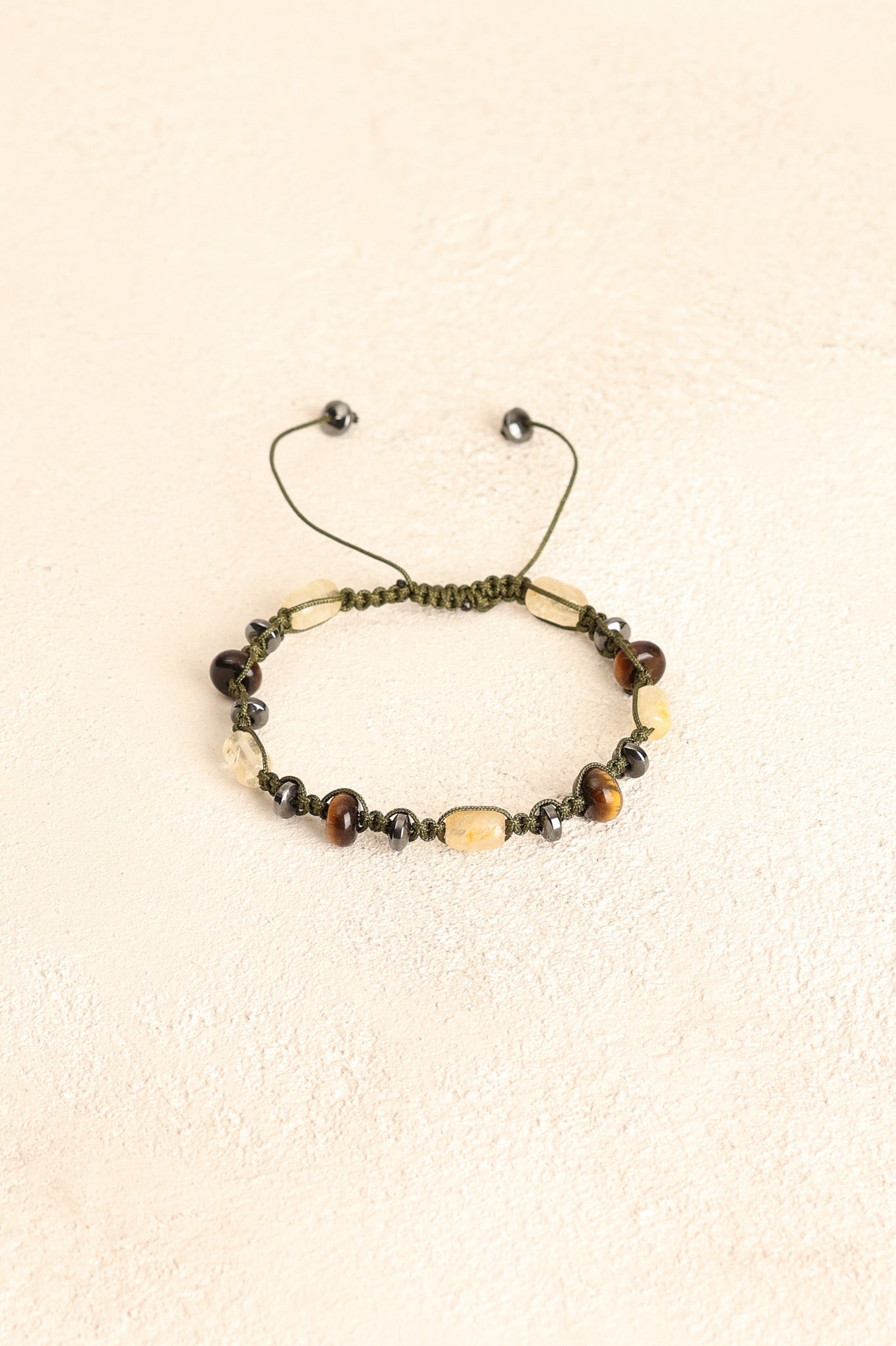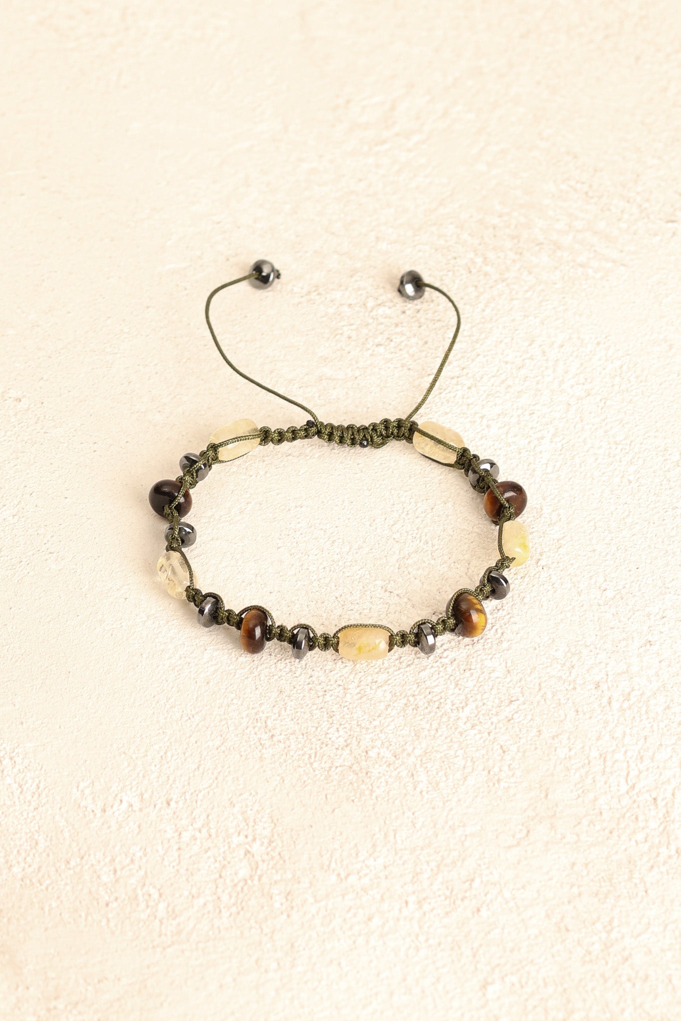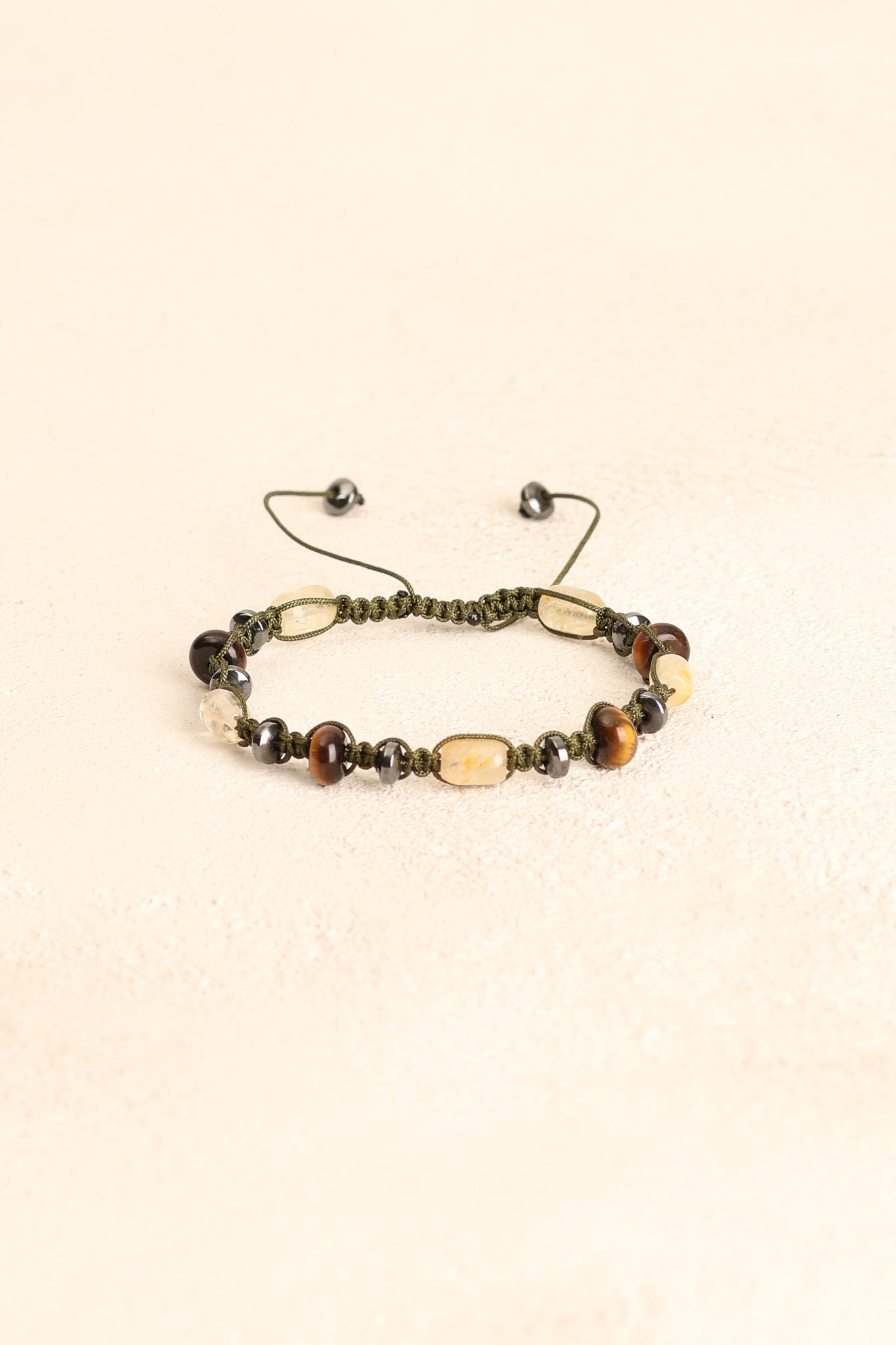 Altın kahverengi yansımalarıyla kaplan gözü, gri metalik parlaklığıyla hematit ve canlı sarı tonlarıyla sitrin taşları; el işçiliğiyle örülmüş makrome tasarımda zarif bir uyum sergiler.