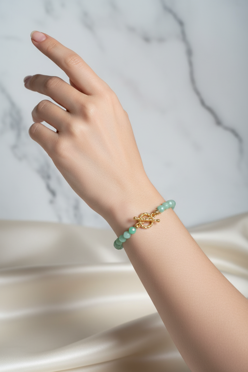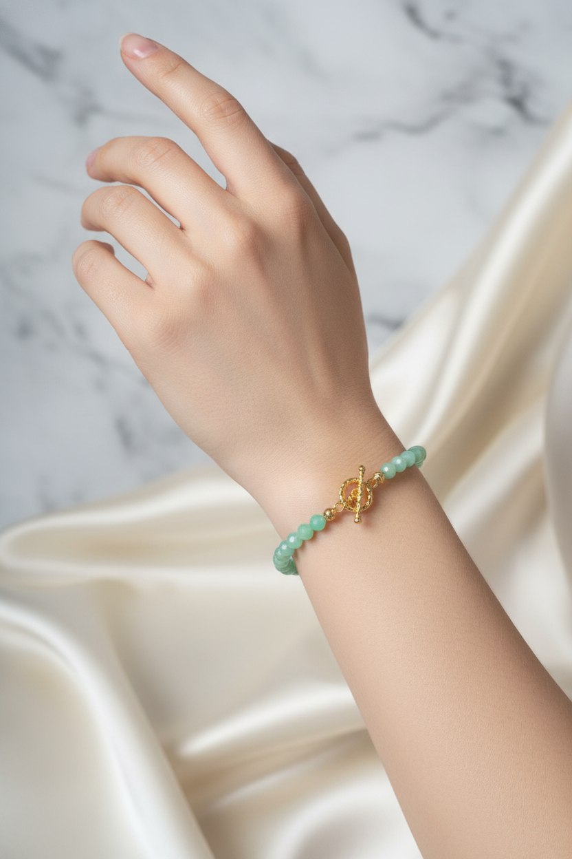 Krizopras taşının canlı yeşil tonları, altın kaplama detayların lüks ışıltısı ve gümüş aparatın zarif dokunuşuyla bu bileklikte buluşuyor. Doğal taşın dikkat çekici rengi, günlük kombinlerde sade bir şıklık, özel günlerde ise sofistike bir tamamlayıcı olarak öne çıkar.