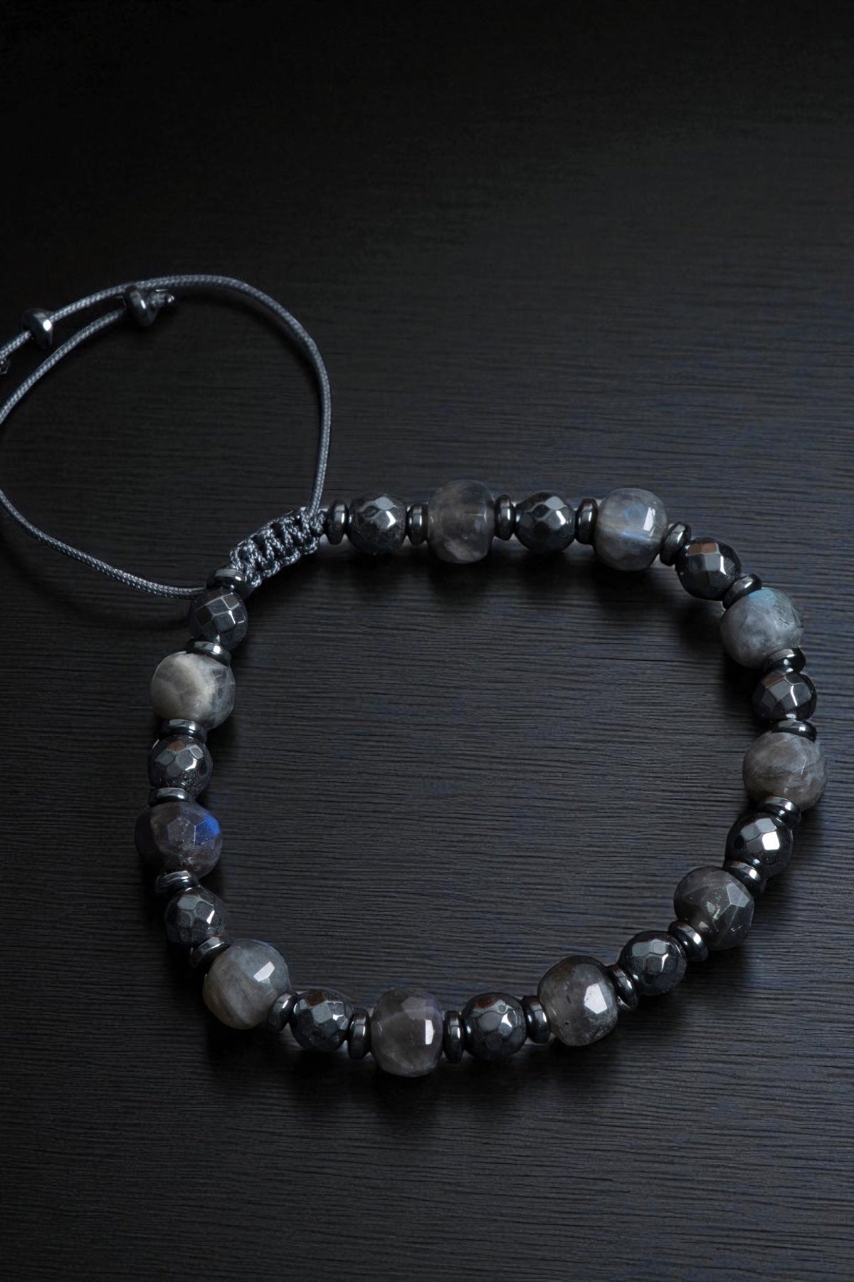 Labradoritin ışıltılı dokusu ve hematitin güçlü duruşunu bir araya getiren bu bileklik, stiline karakterli bir dokunuş katmak isteyenler için ideal bir seçimdir.