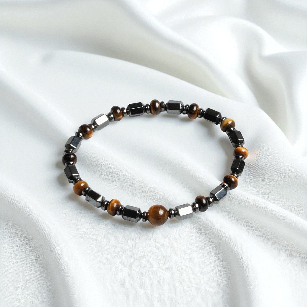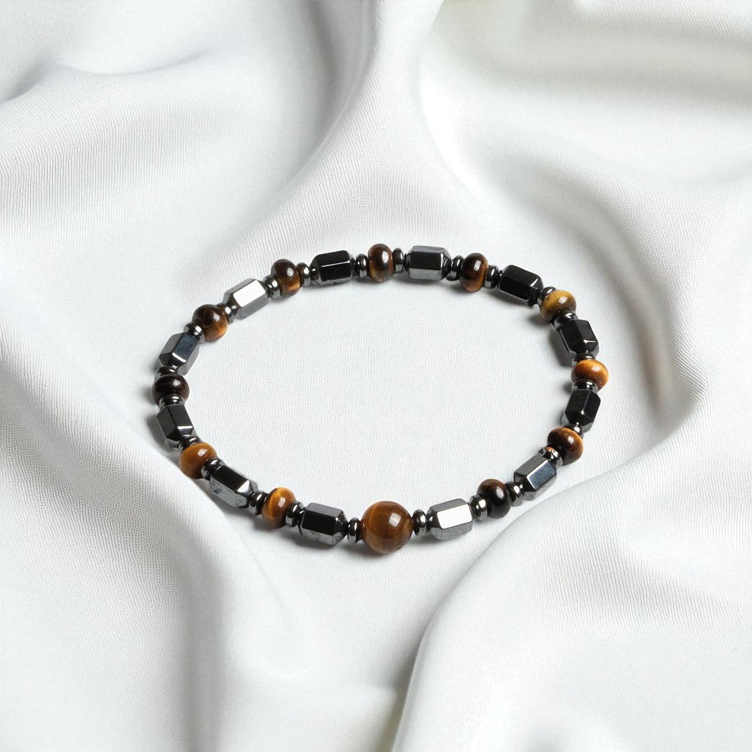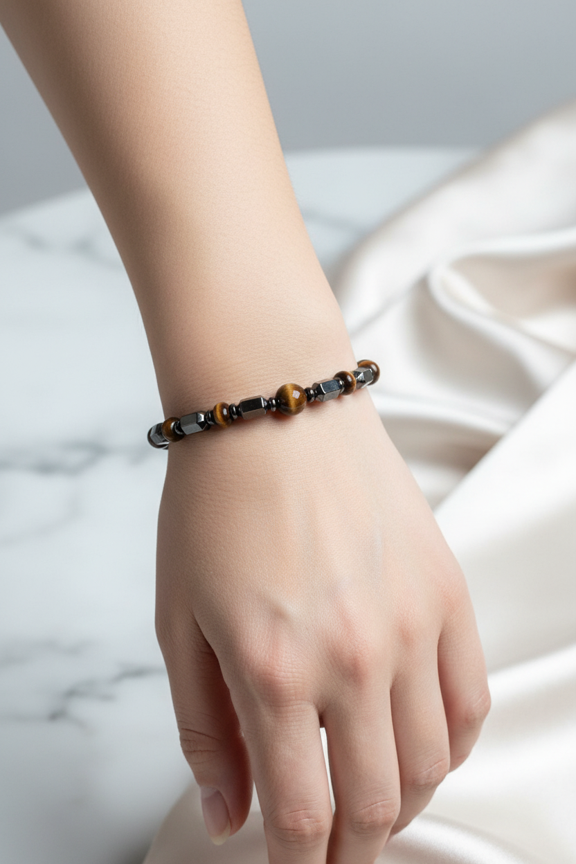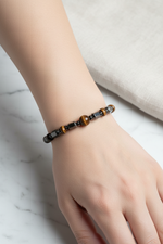Kaplan gözü ve hematit taşlarının uyumuyla tasarlanan bu doğal taş bileklik, güçlü ve modern görünümüyle öne çıkar. El işçiliğiyle özenle hazırlanmış olan tasarım, günlük kullanımda ve özel günlerde stilinizi tamamlayan estetik bir aksesuardır.