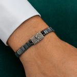El işçiliğiyle üretilen makrome örgüsü sayesinde bileğe kolayca uyum sağlar. Ayarlanabilir yapısı sayesinde farklı bilek ölçülerine rahatlıkla takılabilir. Doğal hematit taşlarının metalik gri parlaklığı, gümüş tuğra aparatıyla kusursuz bir uyum yakalar.