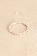 Zarif pembe tonlarıyla öne çıkan pembe kuvars ve beyaz damar desenleriyle dikkat çeken havlit taşları, özenle seçilerek 4 mm boyutunda işlenmiş ve çift sıra dizilimle modern bir makrome bileklik tasarımında bir araya getirilmiştir.