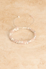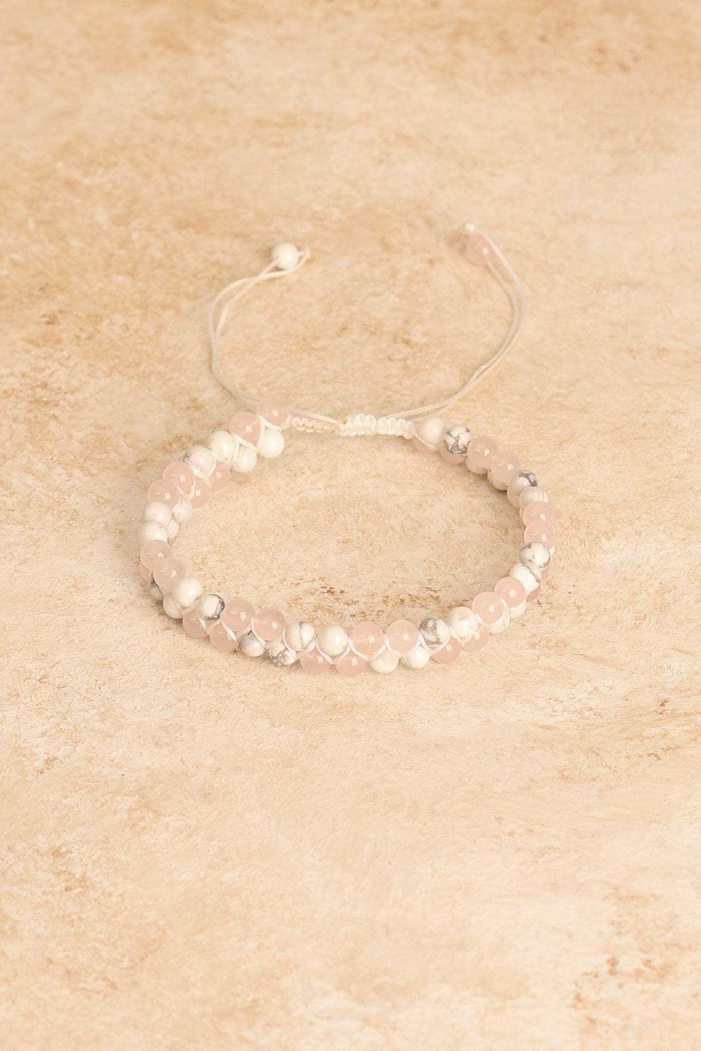 Pirtash ile pembe kuvarsın zarafetini ve havlitin doğal beyaz desenlerini, çift sıra makrome şıklığı ve bilimsel güvenceyle bileğinizde taşıyın.