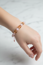 Pembe kuvarsın yumuşak ve romantik tonları, sitrinin bal sarısı ışıltısıyla buluşarak zarif bir uyum ortaya çıkarıyor. Fasetli kesim taşların ışığı çok yönlü yansıtması, bilekliğe göz alıcı bir parlaklık katıyor. Modern ve zarif görünümüyle günlük kombinlere doğal bir şıklık, özel günlere ise sofistike bir dokunuş ekler.