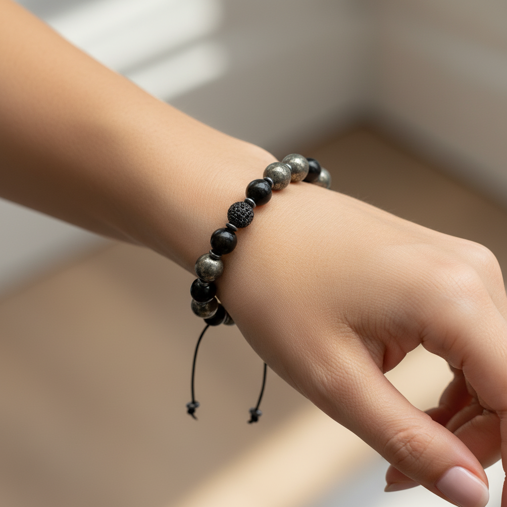 Pirit ve obsidyen taşlarının uyumuyla tasarlanan bu doğal taş makrome bileklik, zirkon aparat detayıyla modern ve zarif bir görünüm kazanır. El işçiliğiyle özenle hazırlanan dayanıklı makrome örgü, günlük kullanımda ve özel günlerde şıklığınızı tamamlayan estetik bir aksesuardır.