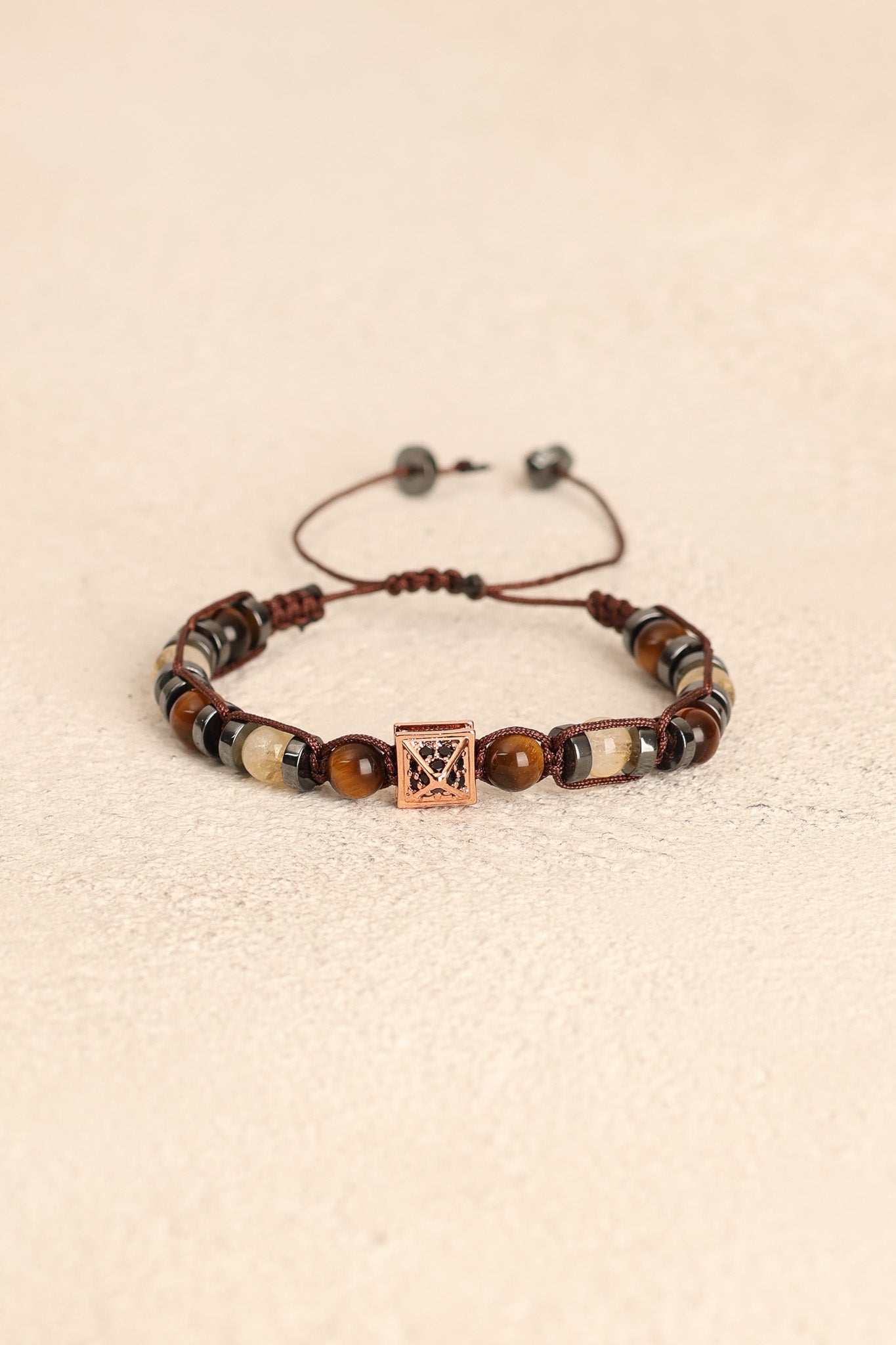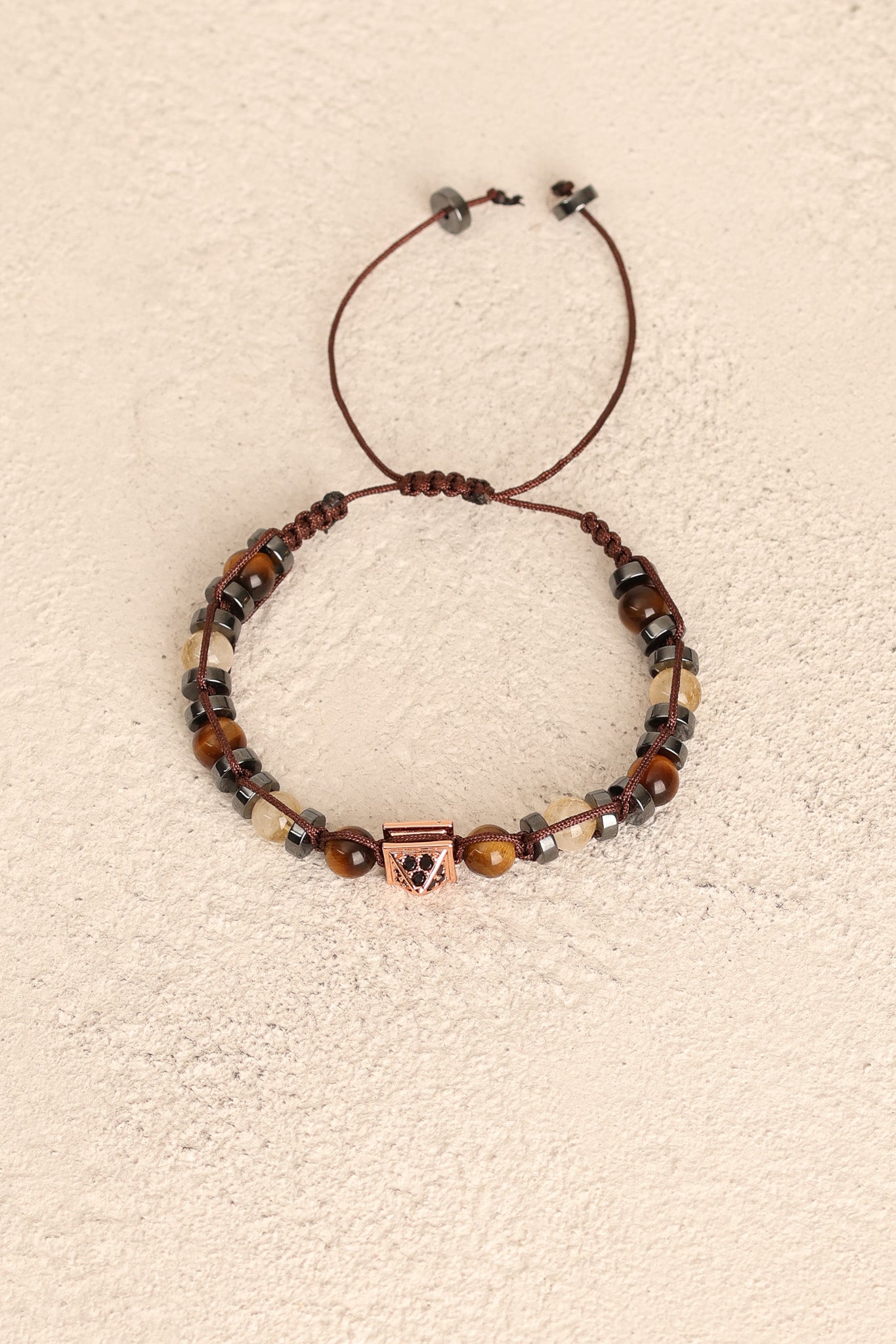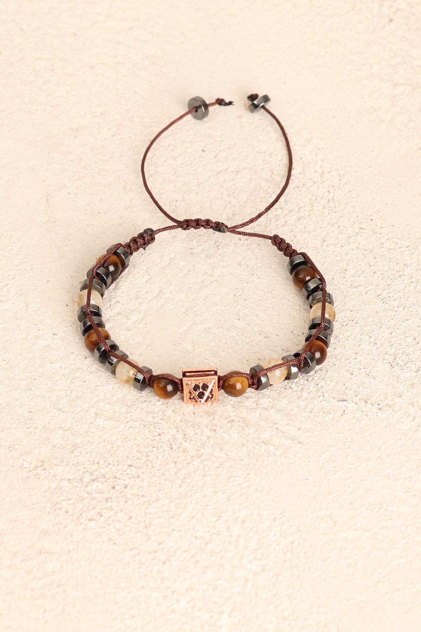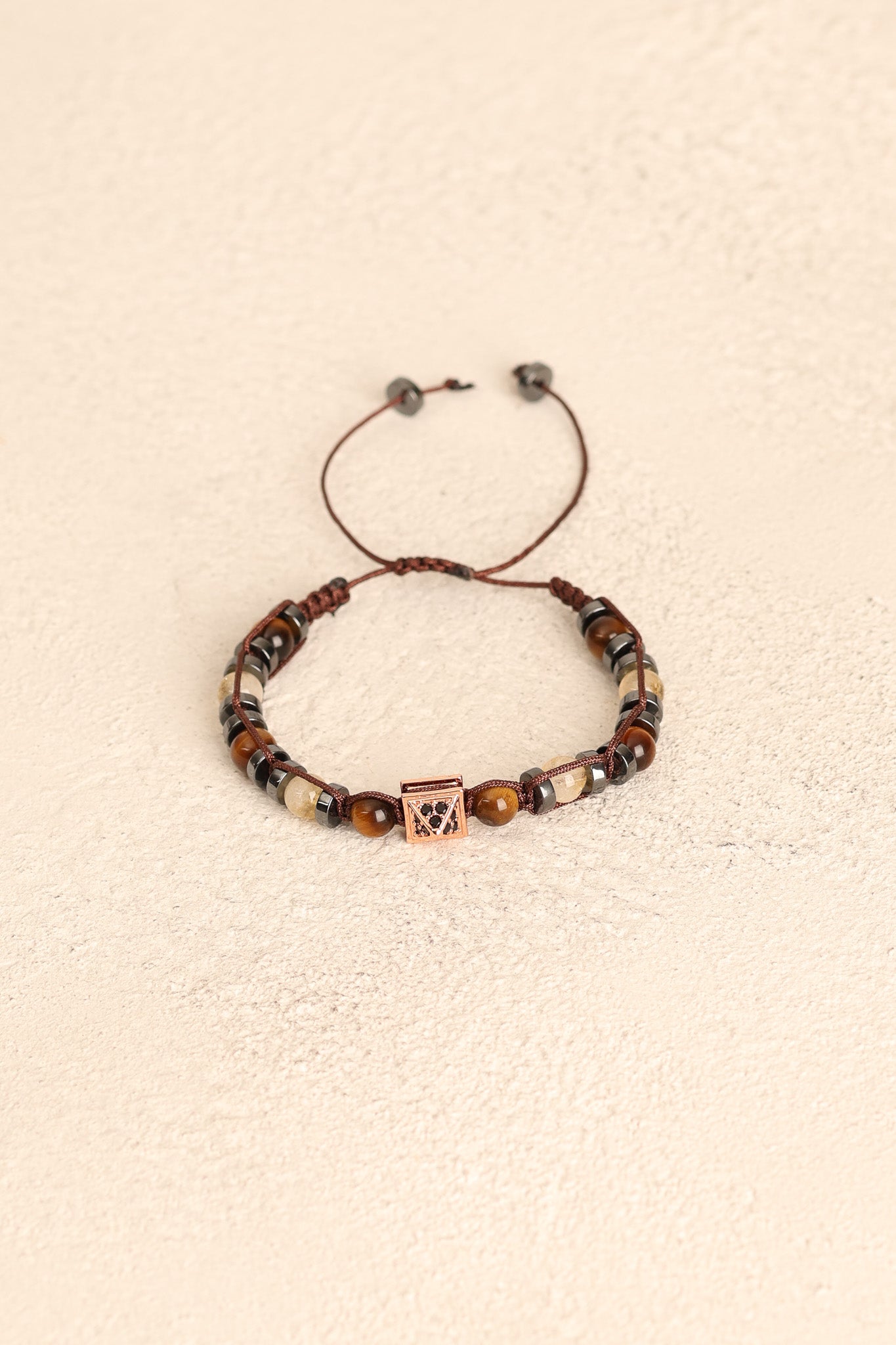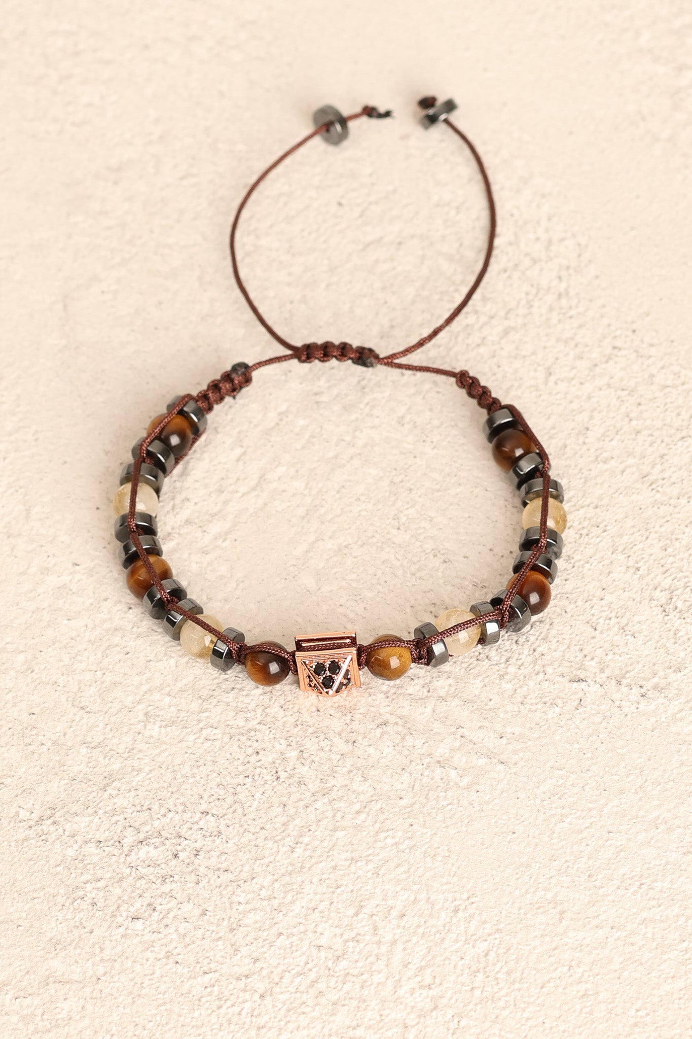 Altın sarısı tonlarıyla sitrin, kahverengi ve altın yansımalarıyla kaplan gözü ve gri metalik parlaklığıyla hematit taşları; el işçiliğiyle örülmüş makrome tasarımda güçlü bir uyum sergiliyor.