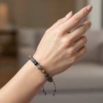 Spektrolit, kaplan gözü, labradorit ve hematit taşlarının uyumuyla tasarlanan bu makrome bileklik, modern ve güçlü görünümüyle dikkat çeker. El işçiliğiyle örülen dayanıklı makrome örgü ve gümüş aparat detayı, tasarıma zarif bir dokunuş katar.