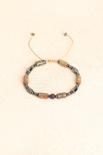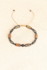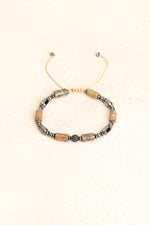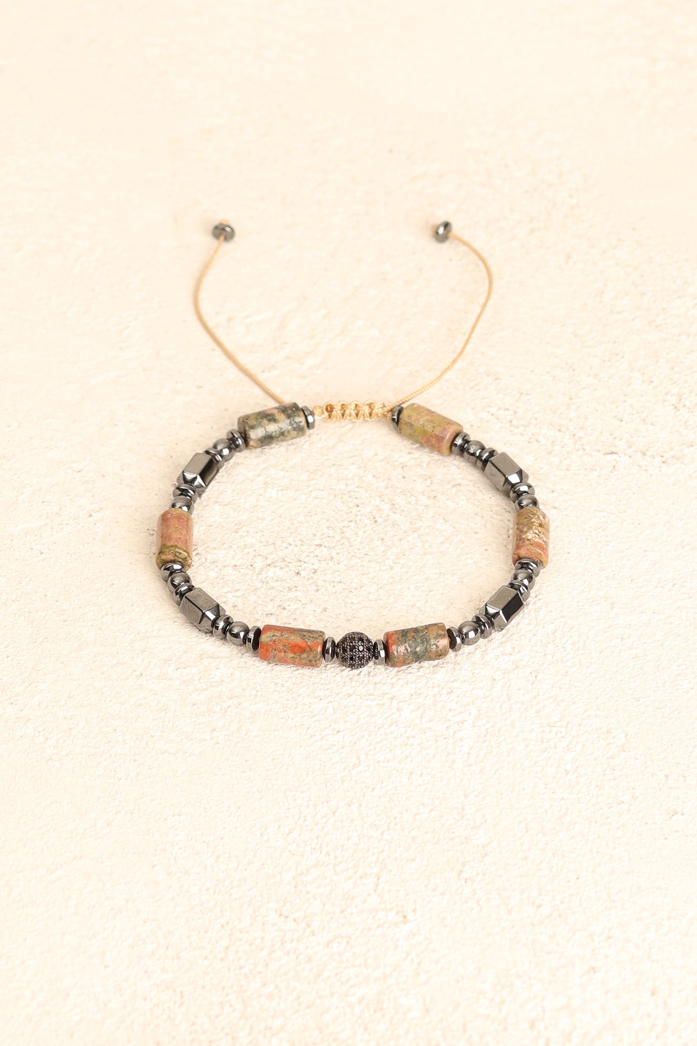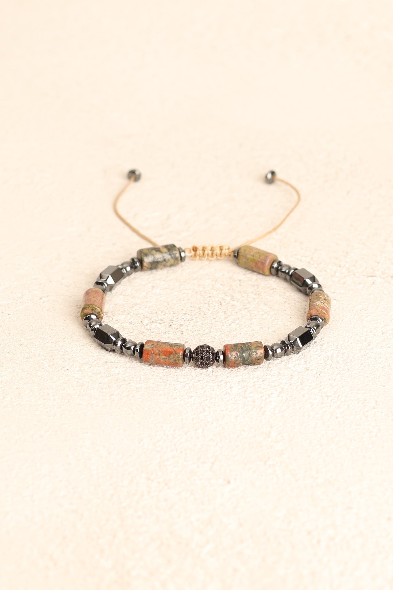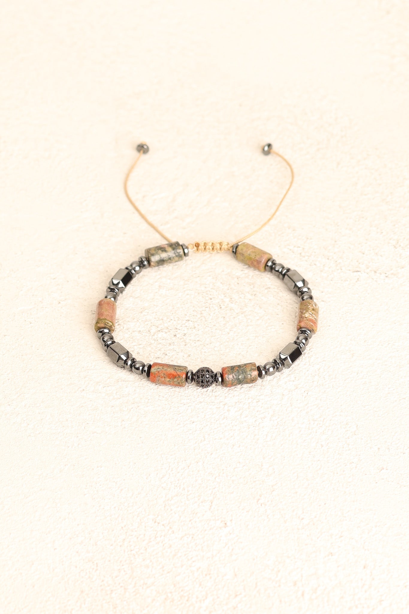 Yeşil ve pembe tonların doğal uyumunu taşıyan unakit taşı ile gri metalik parlaklığıyla öne çıkan hematit taşı, el işçiliğiyle örülmüş makrome bileklikte zarif bir şekilde buluşturuldu.