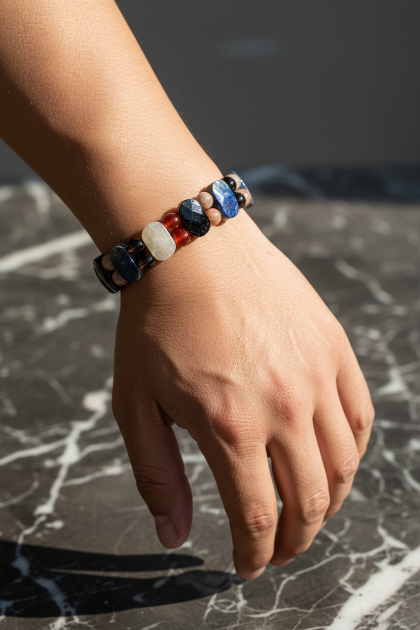 Terazi Burcu Doğal Taş Bileklik – Ay Taşı, Dumanlı Kuvars, Güneş Taşı, Kırmızı Akik, Lapis Lazuli & Siyah Turmalin